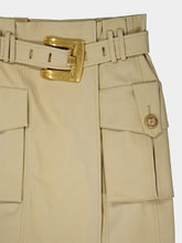 This beige midi skirt by Balmain is crafted in structured cotton gabardine, offering a refined utilitarian aesthetic. Featuring oversized flap pockets with gold button details and a statement high-waisted belt with a bold sculptural buckle, it blends military influence with feminine tailoring. Ideal for elevated daywear or power dressing with a modern twist.