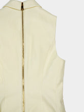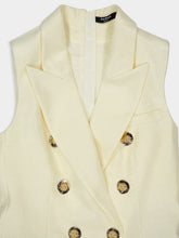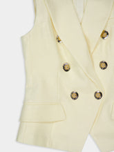 This sophisticated sleeveless vest from Balmain is crafted in a refined ecru viscose blend and tailored for a structured, flattering fit. Featuring a double-breasted front with gold-embellished buttons and peaked lapels, it brings a powerful yet feminine aesthetic. Finished with flap pockets and clean lines, it’s a statement piece ideal for polished layering or sleek standalone styling.
