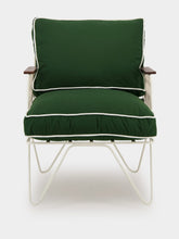 This lounge armchair, with its dark green cushions and sleek white frame, combines comfort with minimalist elegance. The armrests in natural wood finish add a warm touch, making it a stylish feature for any modern home.