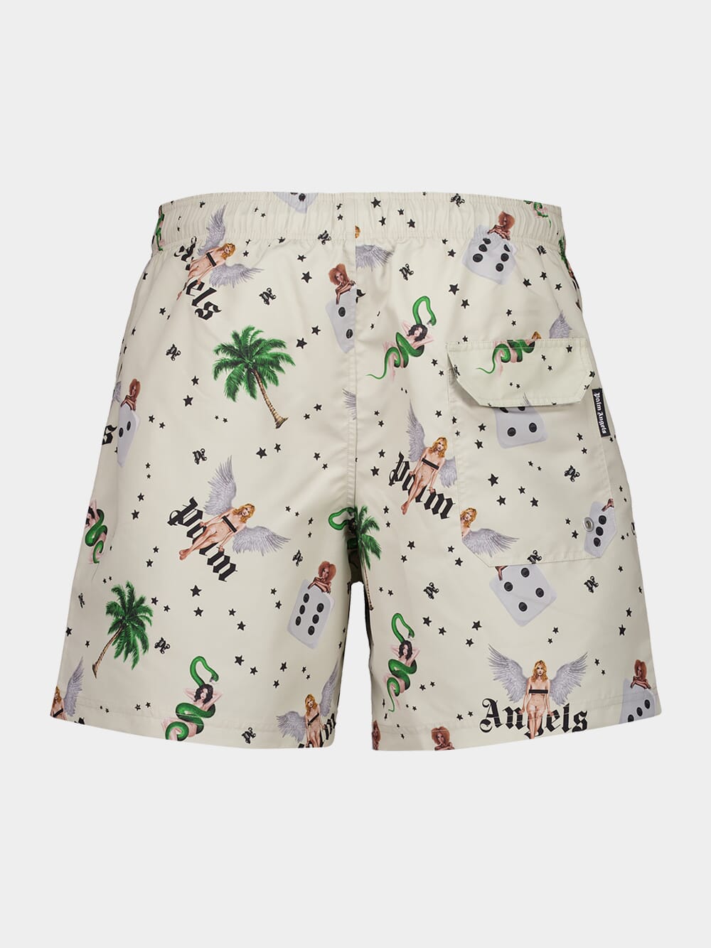 Palm Angels swim shorts featuring an ivory base with pin-up graphics, palm trees, and snakes. Crafted from lightweight polyester with an elastic drawstring waist for a comfortable fit. Ideal for beach outings and poolside lounging with a bold and playful design.