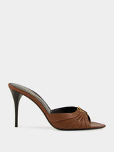 Elegant and striking, the Babylone Mules in aesthetic brown smooth lambskin leather feature a sophisticated pointed peep toe and a gathered upper adorned with the iconic bronze-tone Cassandre emblem. These stiletto mules offer a sleek silhouette with a graceful 9 cm (3.5 inch) heel and a durable leather sole, making them the perfect statement piece for refined evening looks. Crafted with Italian expertise for lasting style and comfort.