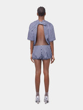 The Striped White and Blue Embroidered T-Shirt by Rabanne is crafted in cotton jersey with a relaxed oversized fit. Featuring black, blue, and white stripes, this piece includes a crew neckline, short sleeves, and elegant hotfix embroidery at the front. A bow tie closure at the back adds a delicate and refined touch. Made entirely from cotton, this T-shirt blends contemporary detail with laid-back sophistication.