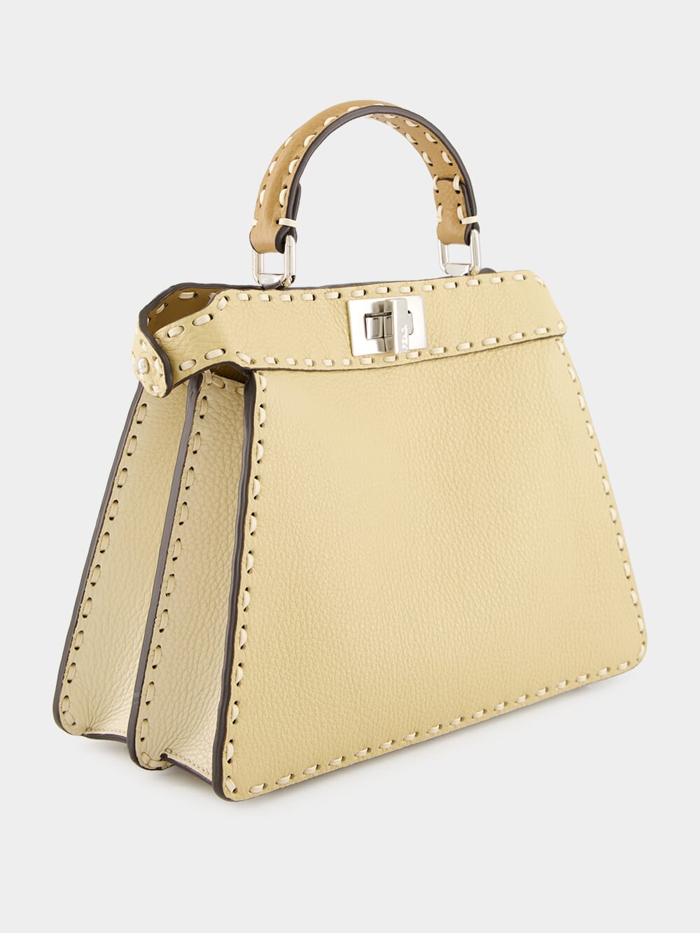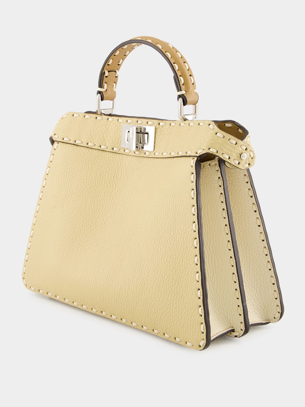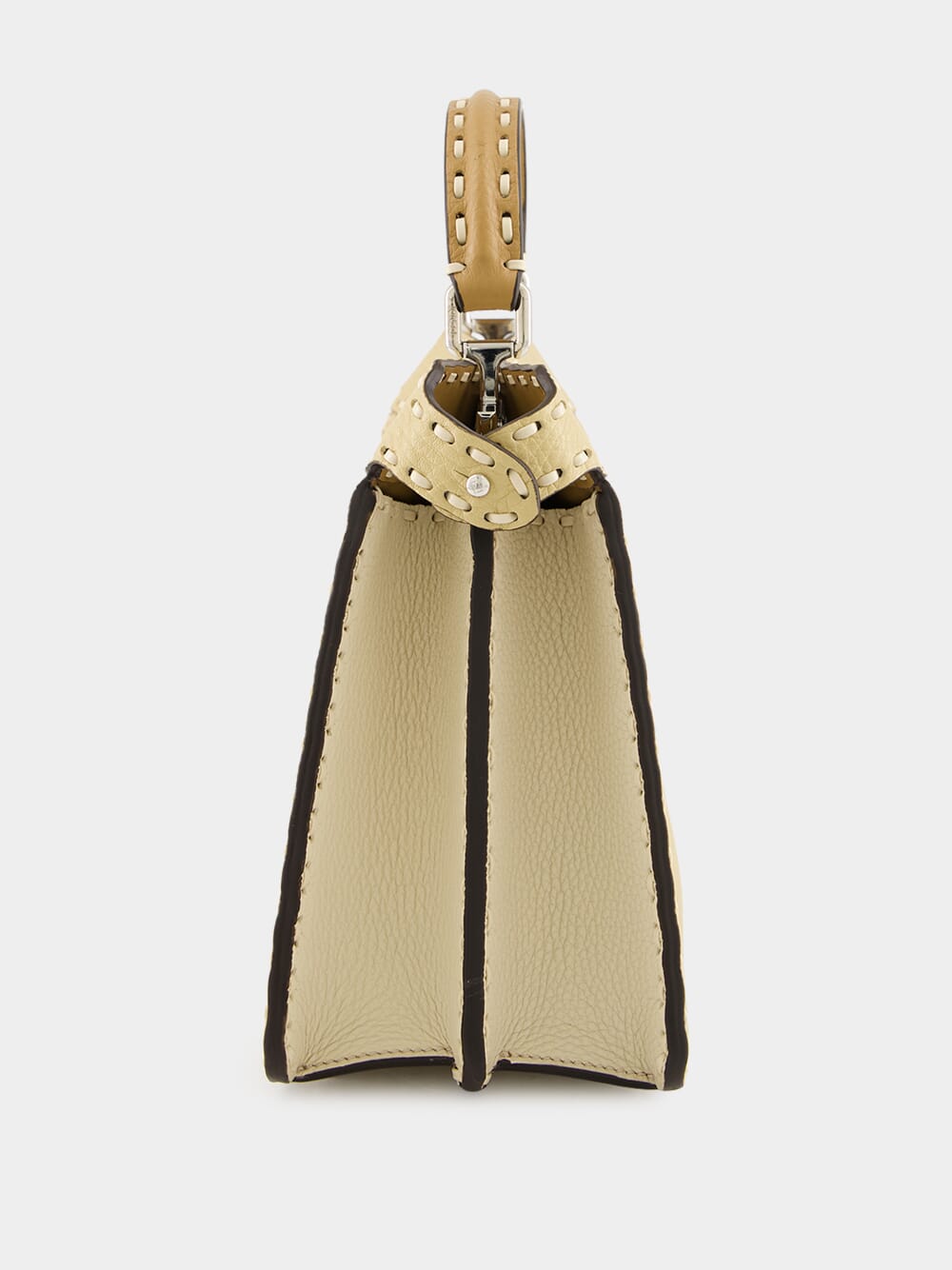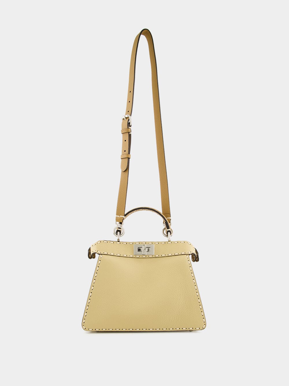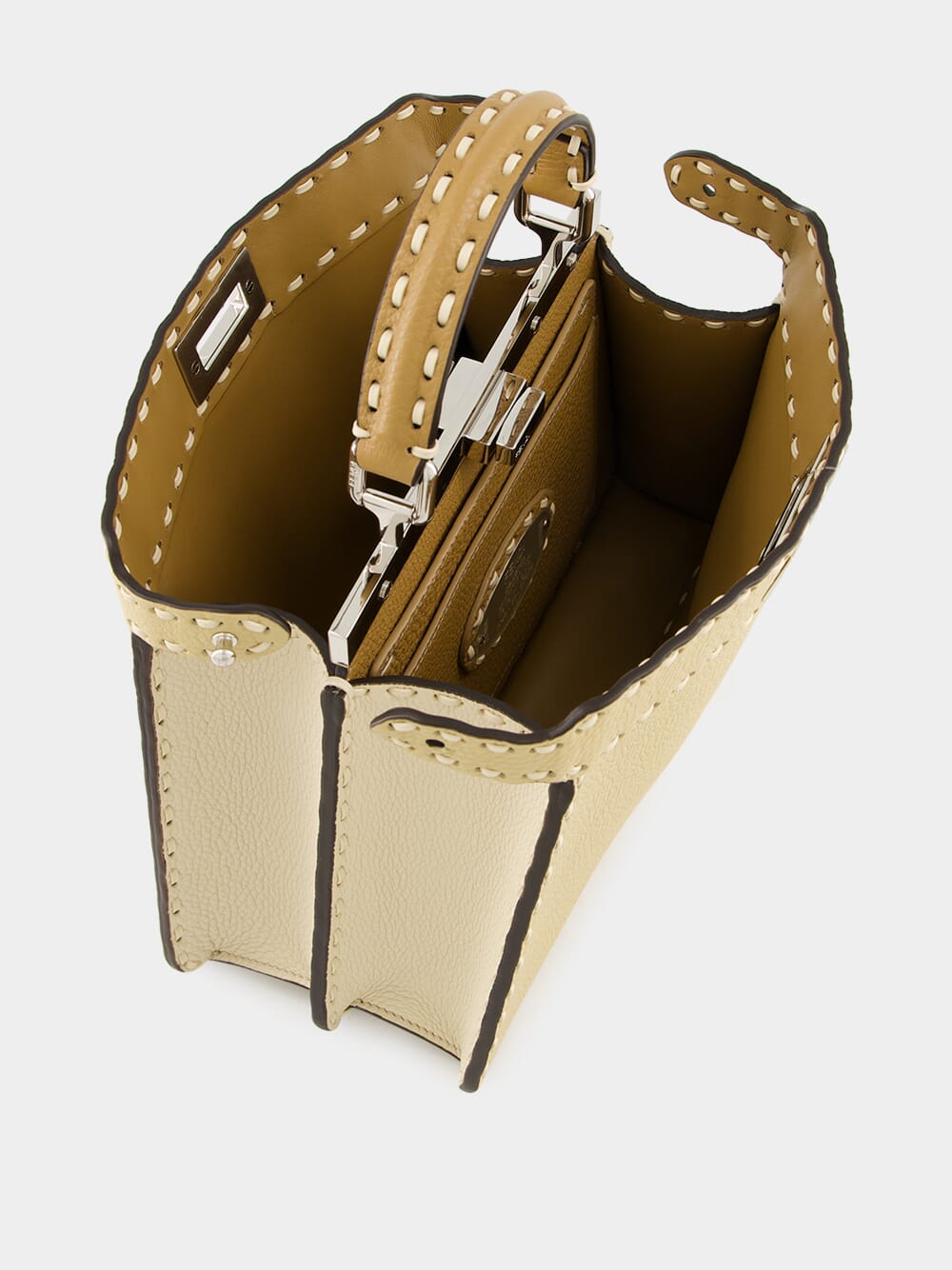 The Peekaboo ISeeU Small Selleria bag is a testament to Fendi's exquisite craftsmanship, featuring 556 hand-sewn macro topstitches that celebrate the heritage of Selleria stitching. Made from straw-coloured Cuoio Romano leather, a naturally grained calfskin tanned using a metal-free process, it is accented by contrasting camelia-toned flaps and sides. The cappuccino-hued calfskin-lined interior offers two compartments separated by a rigid leather partition, with a silver Selleria logo plate and palladium-finish metalware. Designed for versatility, it can be carried by hand, on the shoulder, or cross-body with its adjustable, detachable strap.