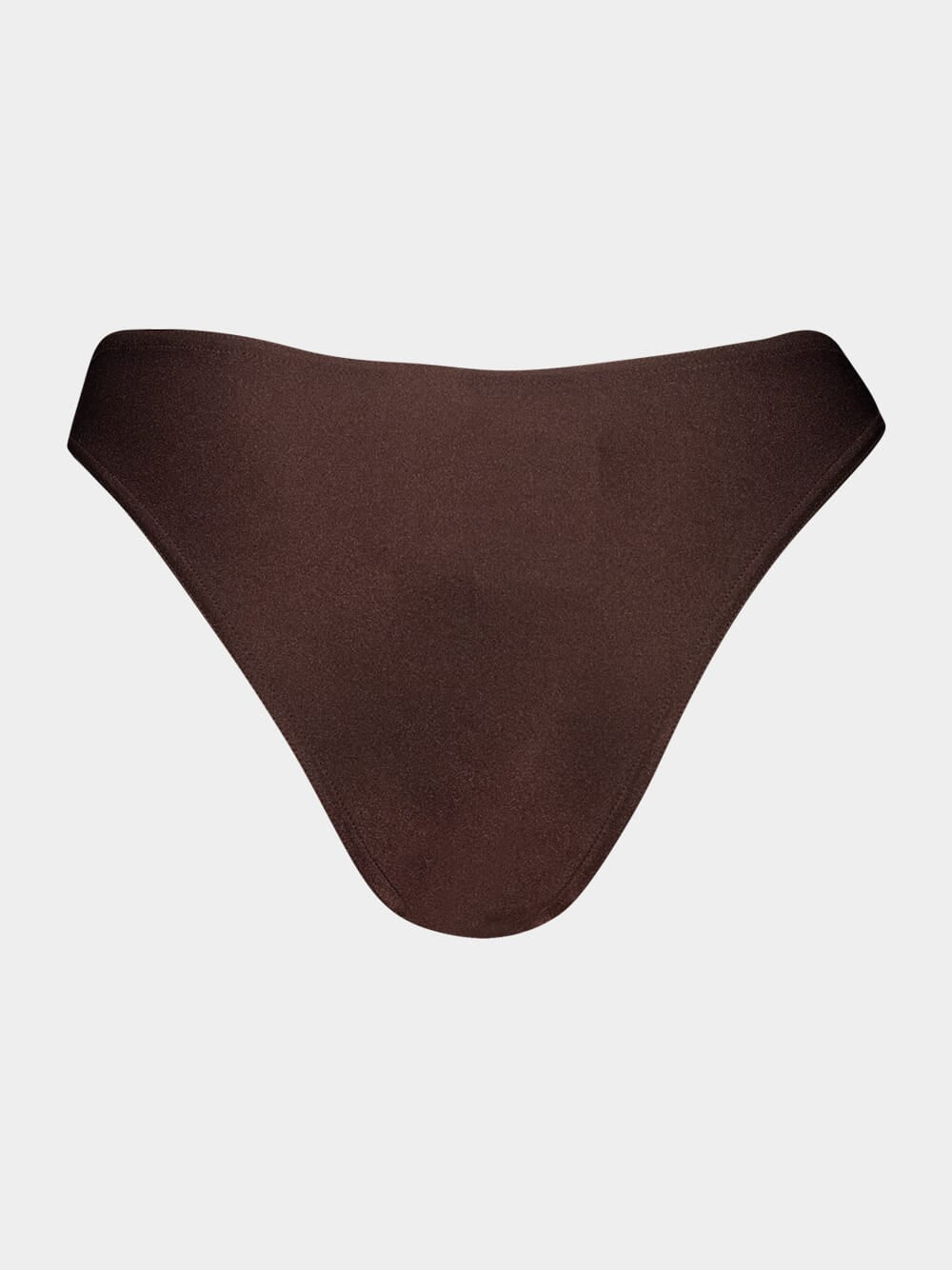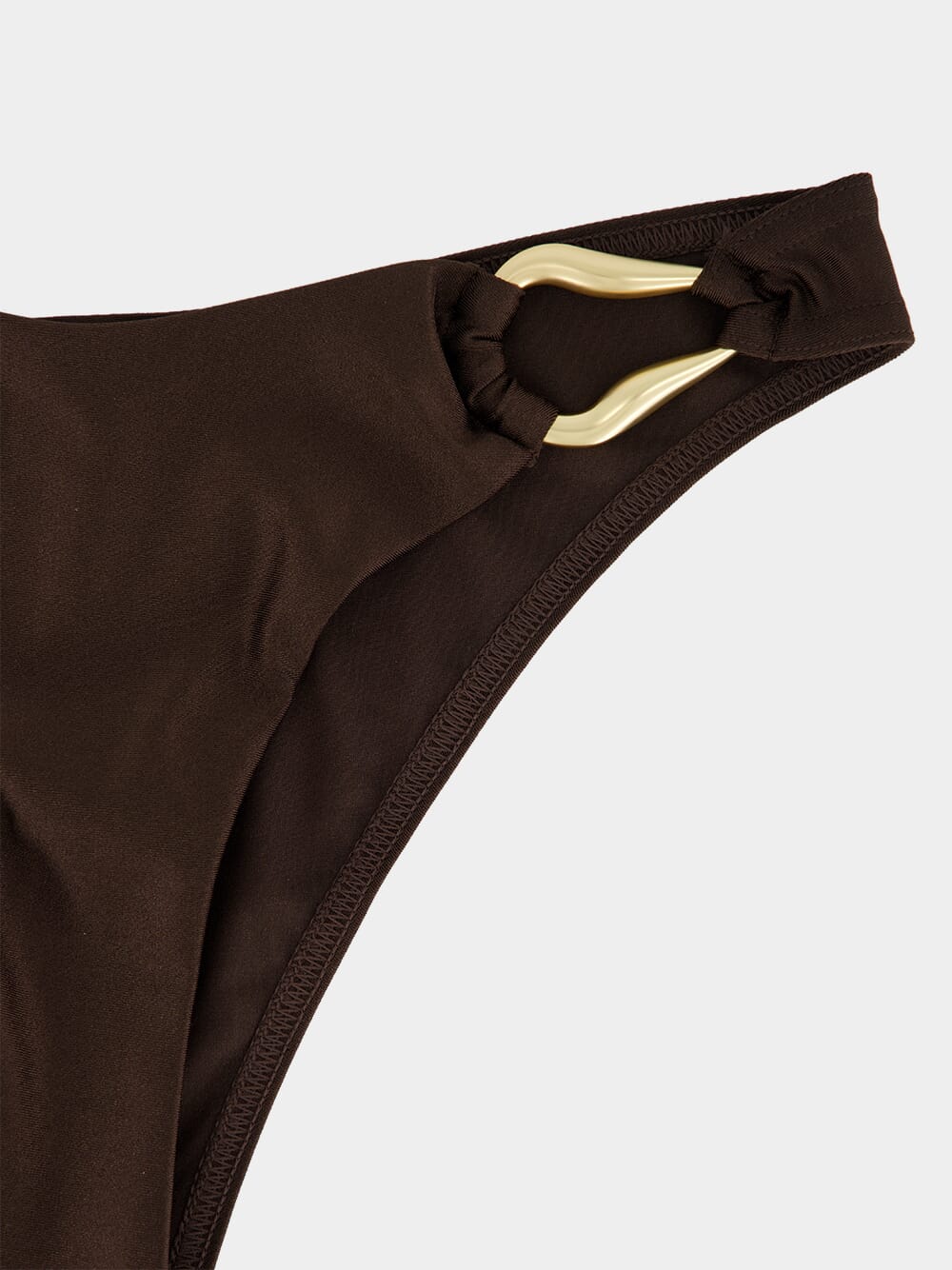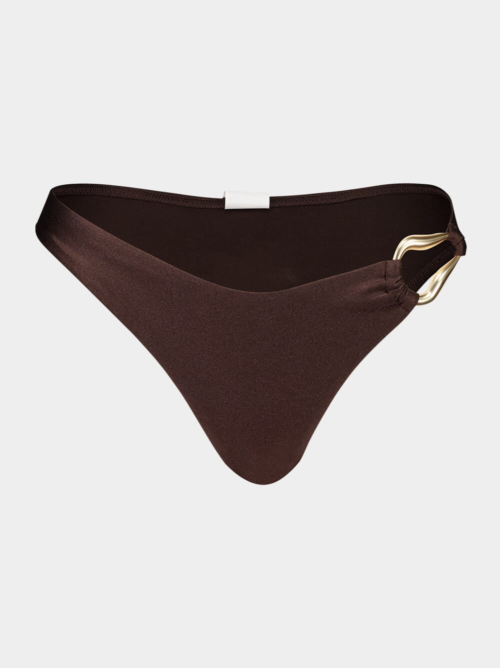 The Chocolate Ascension Trim Pant by Zimmermann is a sleek bikini bottom crafted from glossy Lycra with a shimmering finish. Designed with a flattering V-cut and high-leg silhouette, it offers medium coverage and versatile wear—sitting high or low on the hips. A knot strap with gold-tone buckle detail at the left hip adds an elevated touch of glamour. Fully lined for comfort and support. Bikini top sold separately.