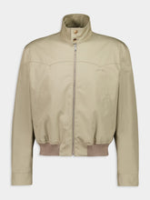 This cropped Harrington jacket by Alexander McQueen is crafted in beige cotton gabardine with tonal logo embroidery for a minimalist yet elevated look. Featuring a two-button collar, front zip fastening, ribbed trims, and side pockets, it offers a refined silhouette with utilitarian flair. Made with organic cotton yarn, it blends conscious design with timeless tailoring.