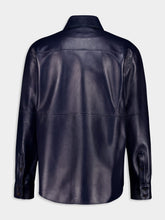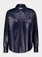 Crafted from smooth navy leather bonded to jersey for added comfort, this long-sleeve shirt by Alexander McQueen blends structured sophistication with modern edge. Featuring a classic collar, front button closure, and two chest flap pockets, the refined silhouette and subtle sheen elevate any contemporary wardrobe with understated luxury.
