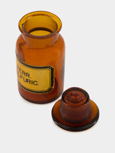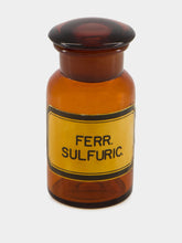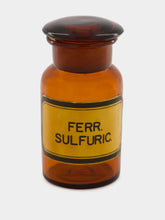 A rare vintage pharmaceutical bottle marked "Ferr Sulfuric," this decorative glass piece in rich amber and orange tones evokes the utilitarian elegance of historical apothecaries. With its timeless silhouette and translucent glow, it serves as a refined accent in modern and eclectic interiors alike—perfect as a vase or collector's item with heritage charm.