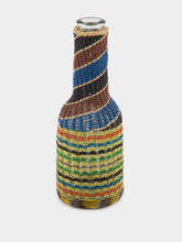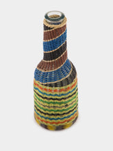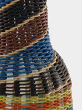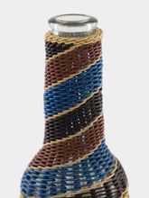 This 18.2cm glass flask features a captivating spiral woven design, intricately handcrafted with a vibrant mix of colours. The unique combination of blue, brown, yellow, and green stripes creates a dynamic and textured appearance, making it an eye-catching decorative piece. Ideal for adding a touch of artisanal charm to any space, this flask is perfect for displaying on shelves, tables, or as part of a curated décor collection. Its colourful, global-inspired design makes it a standout accent in any room.