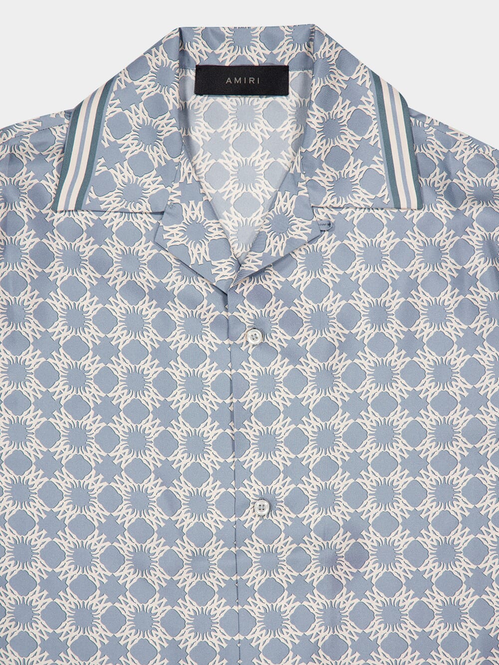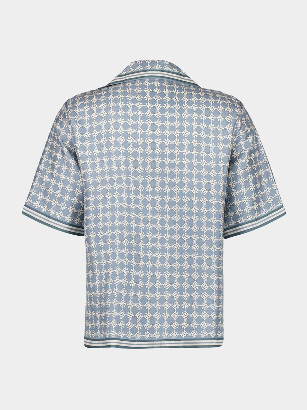 The Light Blue MA Quad Bowling Shirt features the signature MA Quad monogram print, adding a luxurious touch to a casual design. Crafted from 100% silk twill, it offers a fluid drape and an ultra-soft feel. Designed with a notched collar and button-down closure, this shirt embodies effortless elegance and modern style. Perfect for warm-weather outings, it combines comfort with high-end craftsmanship. Made in Italy, this piece is a versatile addition to any sophisticated wardrobe.