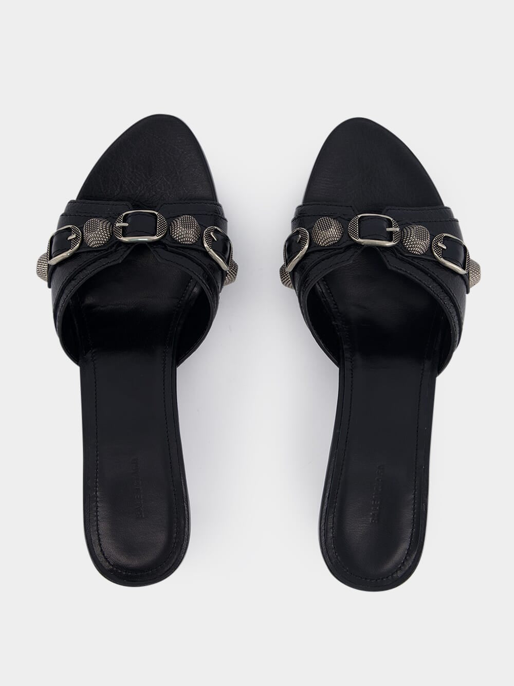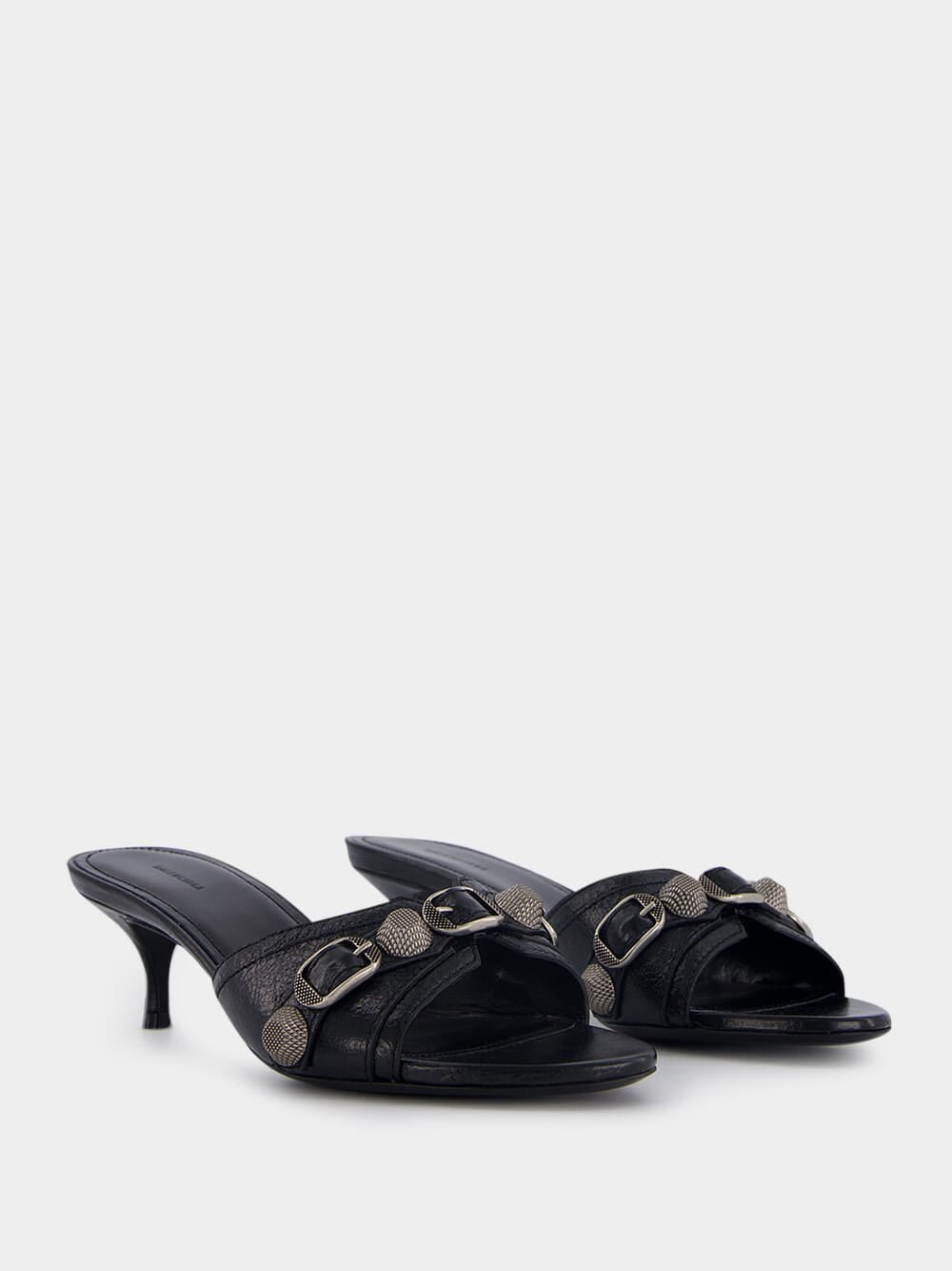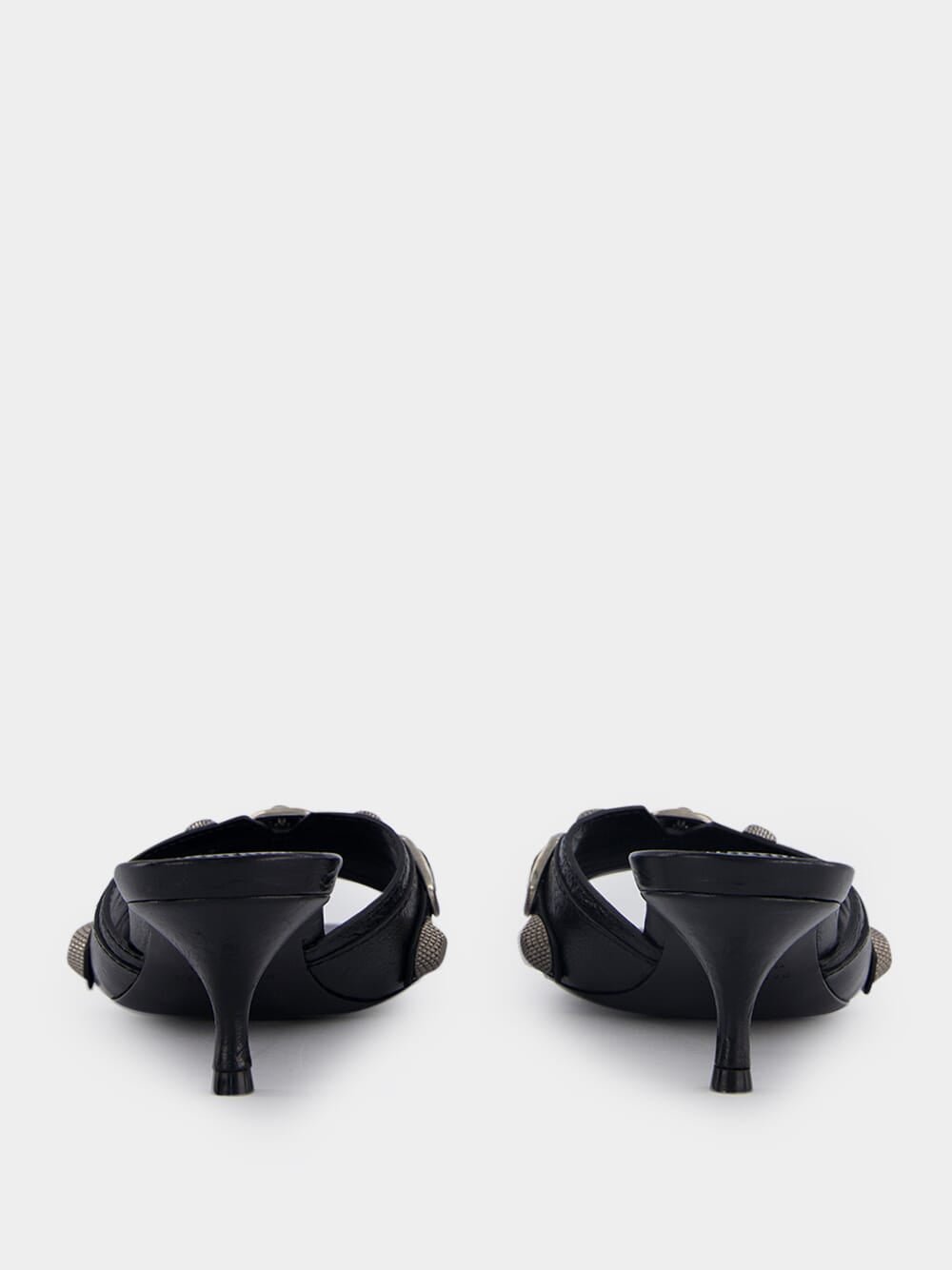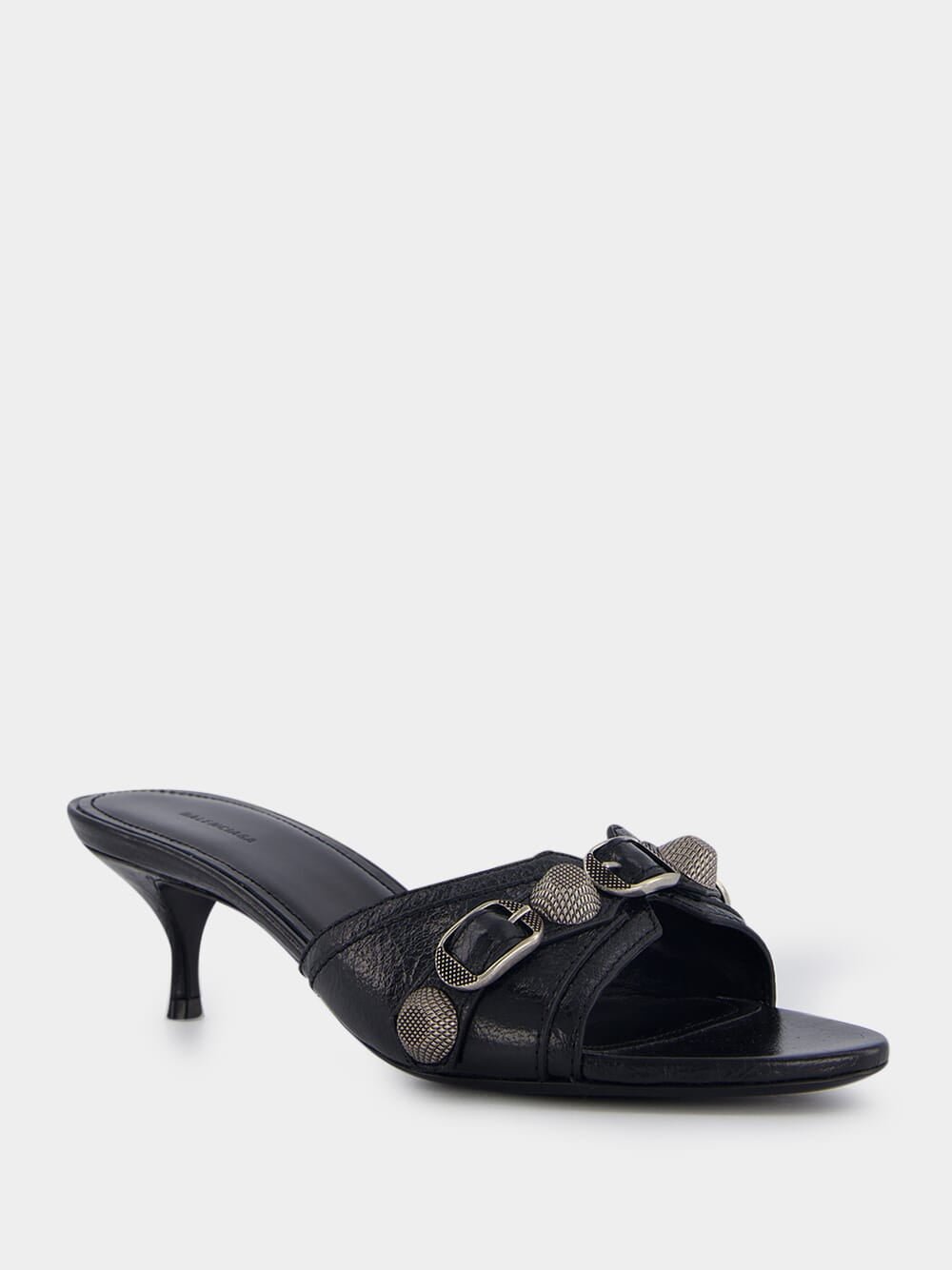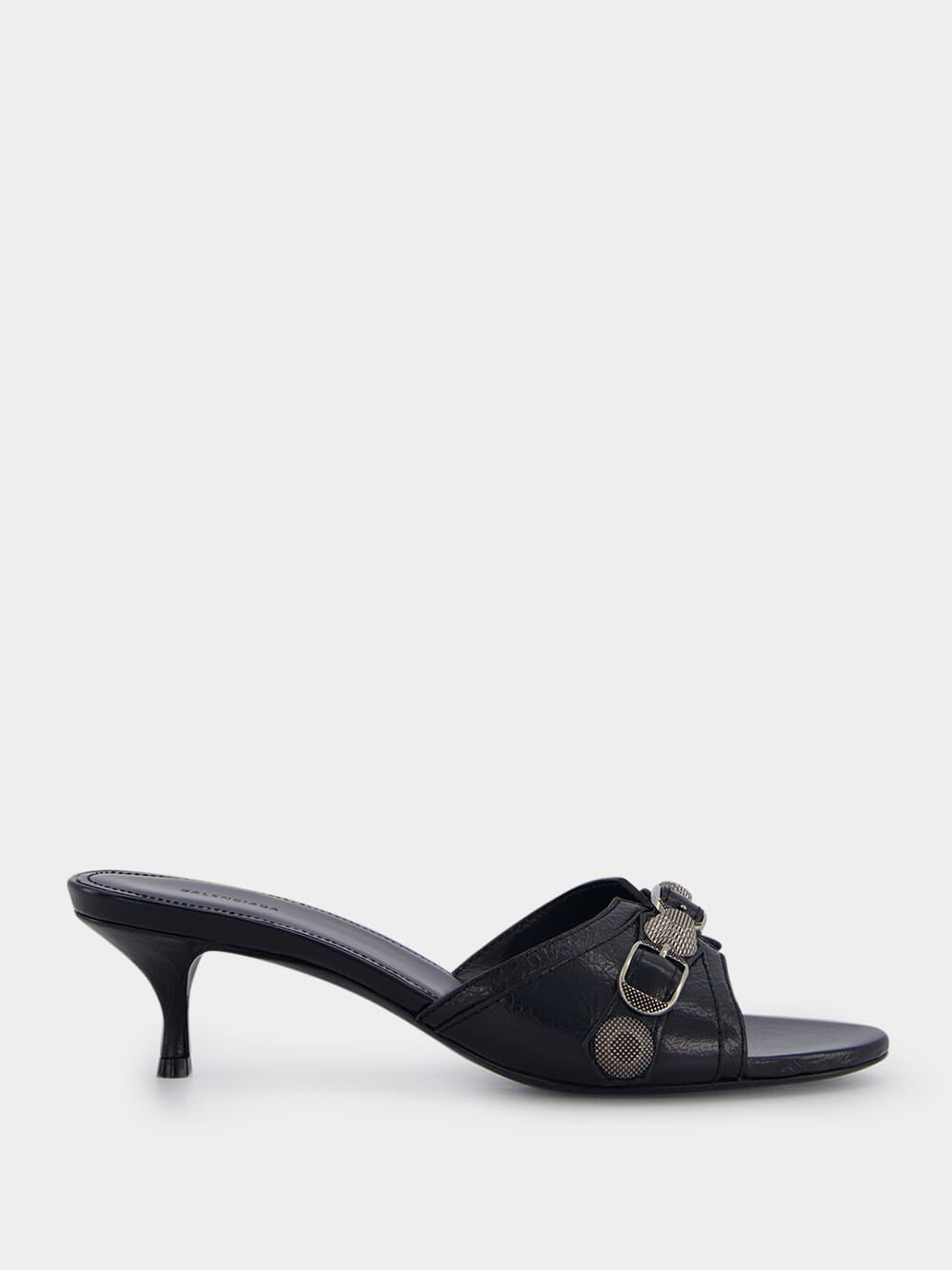 Cagole 50mm Mules, crafted with a high-quality material, these mules feature an open toe design, adding a touch of sophistication and breathability. The buckle detailing and stud embellishments provide a modern and edgy aesthetic, while the aged gold-tone hardware adds a luxurious and refined touch. The branded insole showcases the attention to detail and quality craftsmanship. With a comfortable 50mm kitten heel, these mules offer a stylish lift without compromising on comfort.