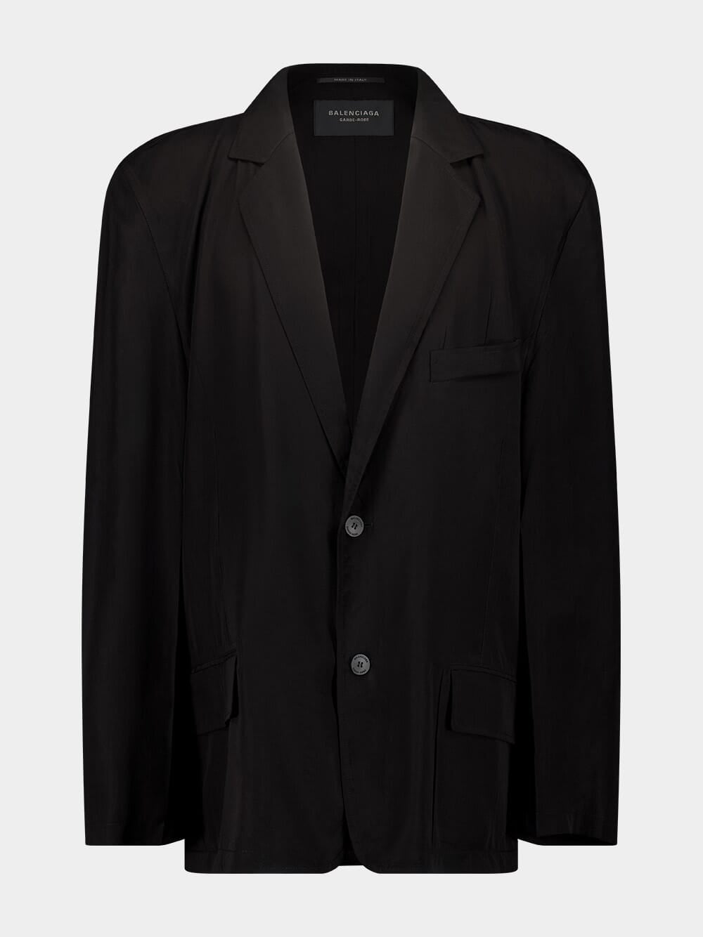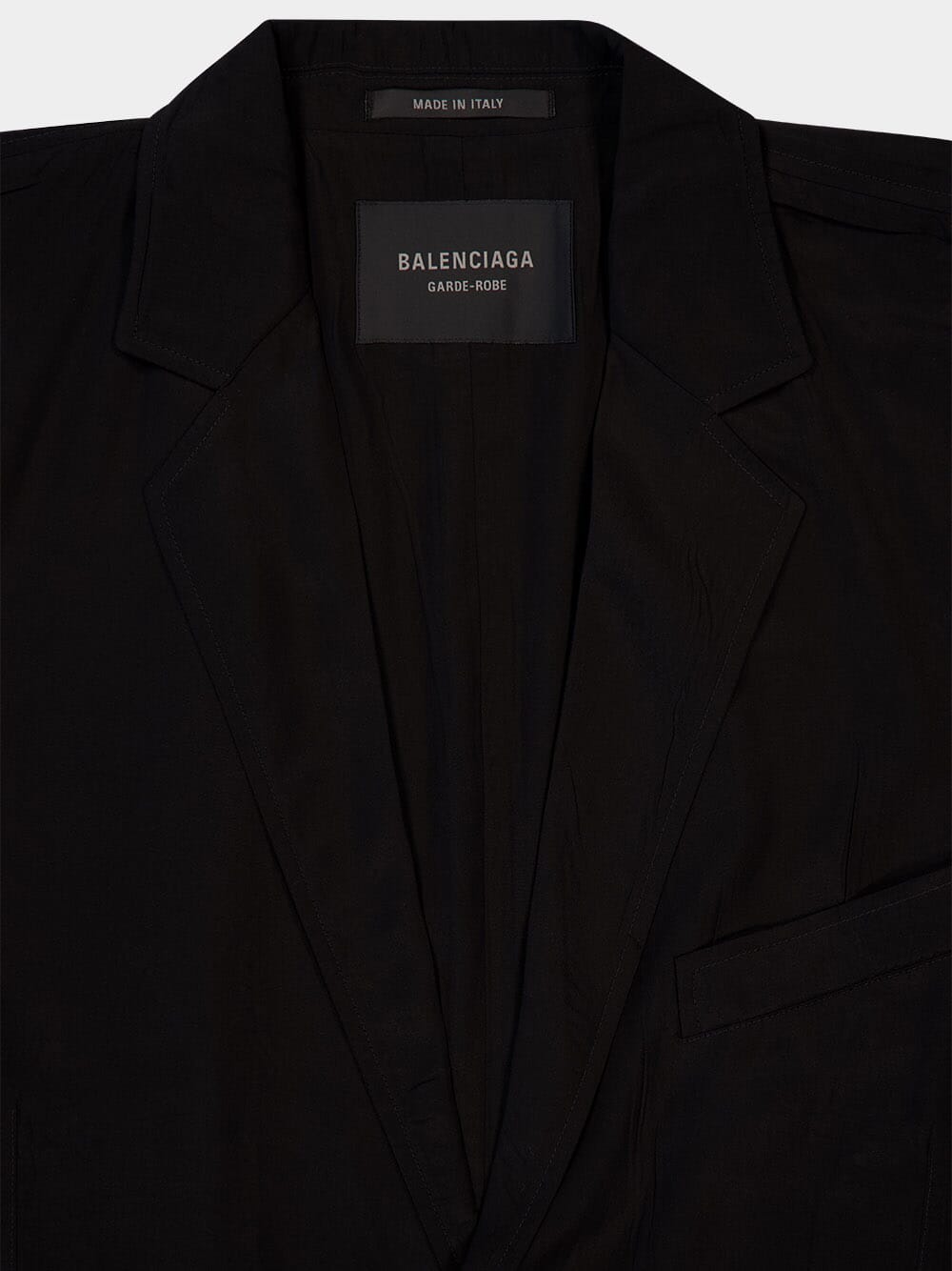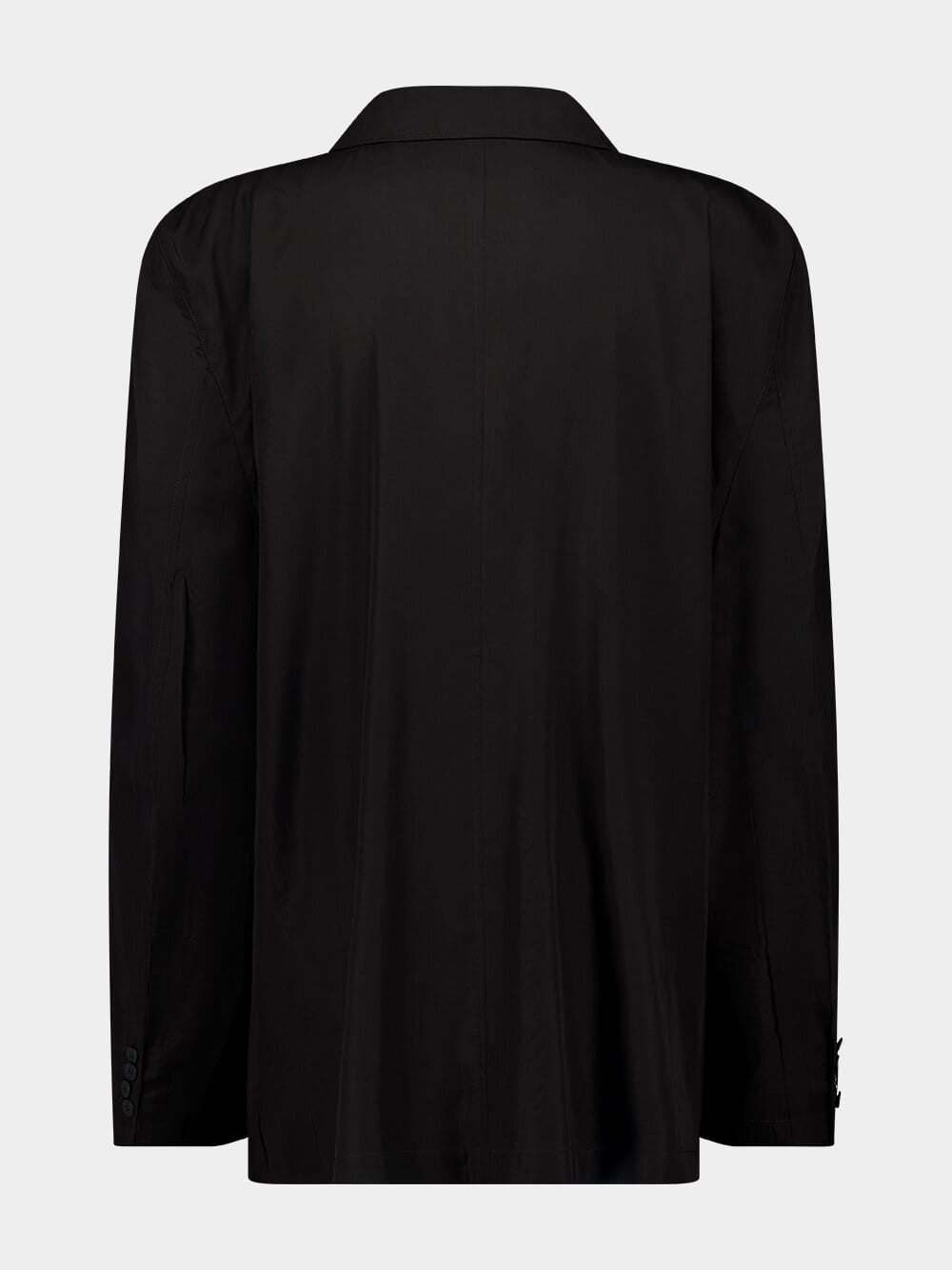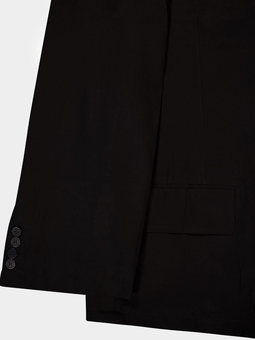 This Black Single-Breasted Jacket is crafted from lightweight fabric, offering a refined and versatile look. Designed with a button closure at the front, it features notched lapels, long sleeves with buttoned cuffs, and a straight hem. The jacket is fully lined for comfort and includes a breast pocket, two side flap pockets, and several inside pockets for practicality. Made in Italy, it exemplifies timeless tailoring and elegance.