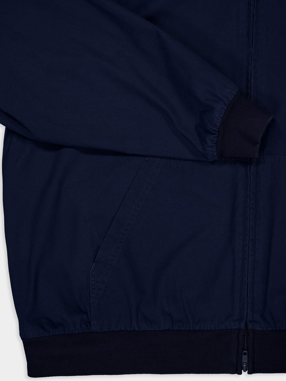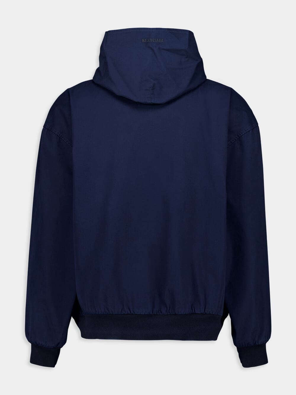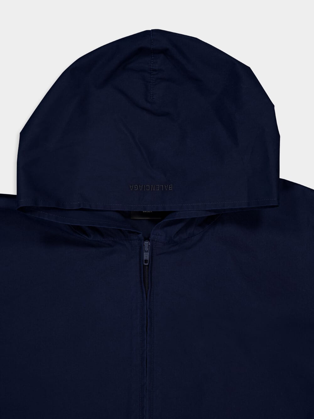 The Balenciaga Zip-Up Hoodie in dark blue cotton poplin offers a large fit and unisex design. It features a hood without drawstring, dropped shoulders, and a double-ended zip fastening. With two front pockets and gathered cuffs and waistline, it combines comfort with style. The tone-on-tone Balenciaga logo embroidered on the hood adds a subtle, sophisticated touch. Ideal for layering in any season.