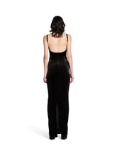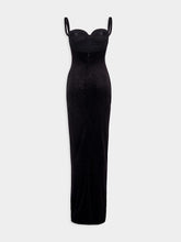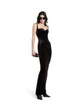 The Fitted Gown in black fluid velvet jersey embodies elegance and sophistication. Featuring two straps and a bustier design with armatures, this maxi-length gown offers a flattering silhouette. The invisible zip at the back ensures a seamless fit. Perfect for formal events, this dress combines timeless style with modern luxury.