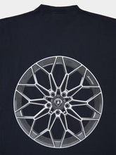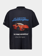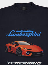 This oversized T-shirt by Balenciaga in collaboration with Automobili Lamborghini is crafted in Portugal from faded black dry jersey cotton. It features bold Lamborghini artwork on the front with a sports car graphic and “Temerario” lettering, while the back showcases an intricate wheel motif. With a relaxed silhouette, crewneck, and short sleeves, it captures streetwear energy and automotive attitude.