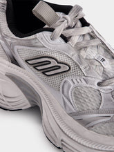 The 10XL Sneaker in white, black, and grey mesh, TPU, and rubber is a standout footwear option. These leather-free sneakers feature an exaggerated volume with a worn-out effect for a unique look. They include mesh, TPU, and rubber materials, a debossed Balenciaga logo on the tongue, and a 3B sports icon artwork in rubber on each side. The sporty B logo adorns the upper, with the shoe size embroidered at the back. Additional features include back and tongue pull-on tabs for easy wear.