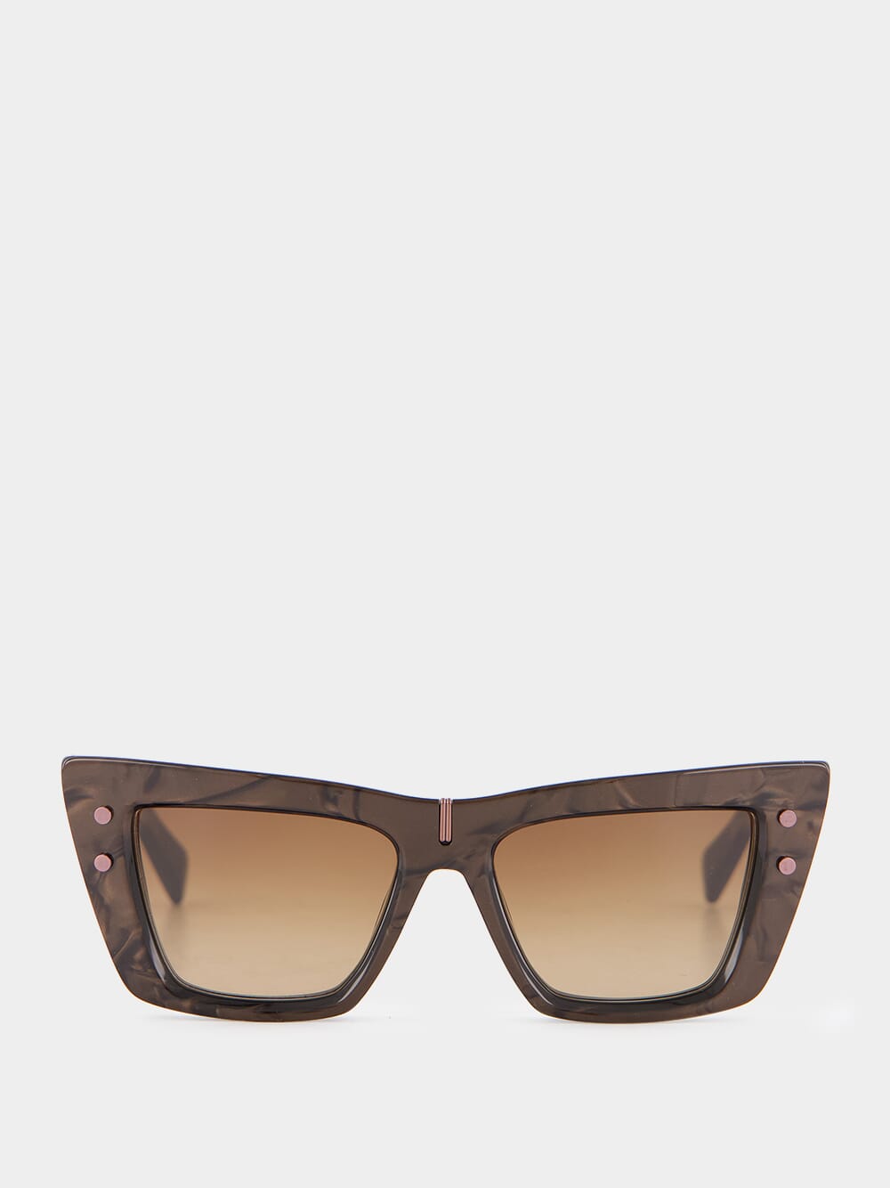 The B-Eye Sunglasses feature a striking square cat-eye shape with smoke lenses, offering a blend of bold style and protection. Crafted from mother-of-pearl acetate, the frame is enhanced with a bridge adorned with a metallic detail. The hinges and screws are engraved with the iconic B logo, while the raised golden Balmain logo on one of the temples adds a luxurious touch. Perfect for a statement look, these sunglasses combine sophisticated design with high-quality materials.
