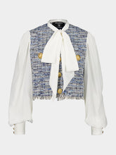This blue tweed and crepe cropped jacket combines classic craftsmanship with modern sophistication. Featuring a structured tweed body adorned with luxurious two-tone "Double Chain Lion" buttons, it is elegantly paired with crepe long sleeves and a pussy-bow collar. The feather fringe hem adds a playful touch, while details such as shirt cuffs with buttons, two patch pockets, and a twill lining ensure refined elegance. Ideal for pairing with high-waisted trousers or skirts, this piece is a standout addition to any wardrobe.