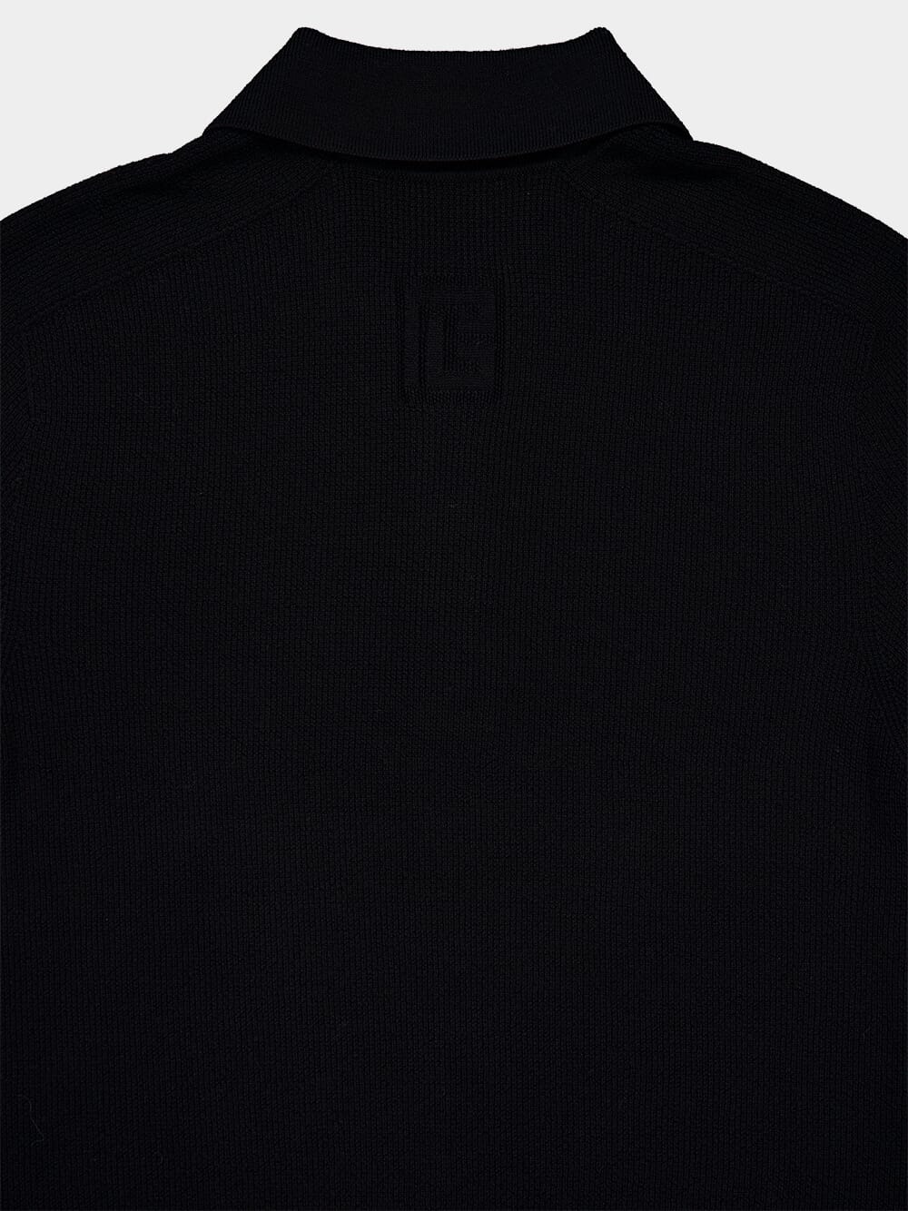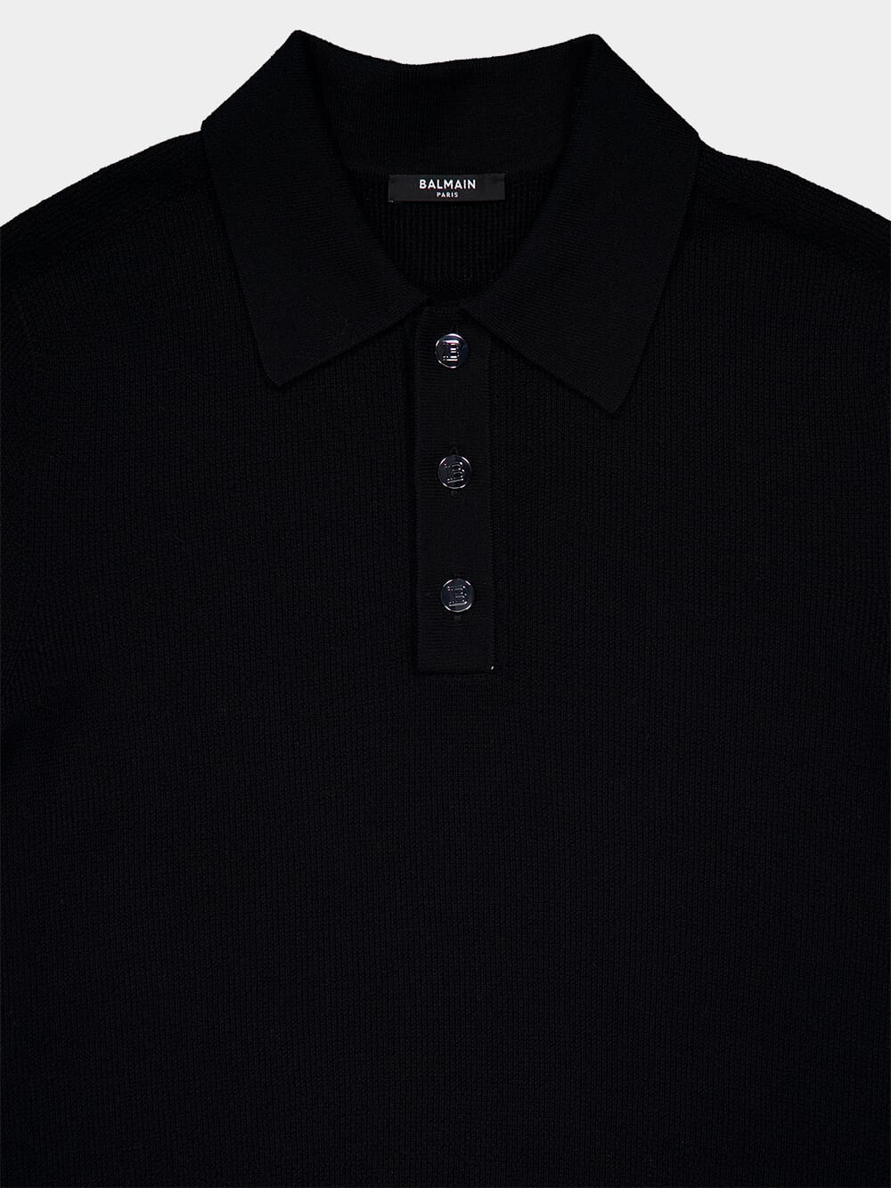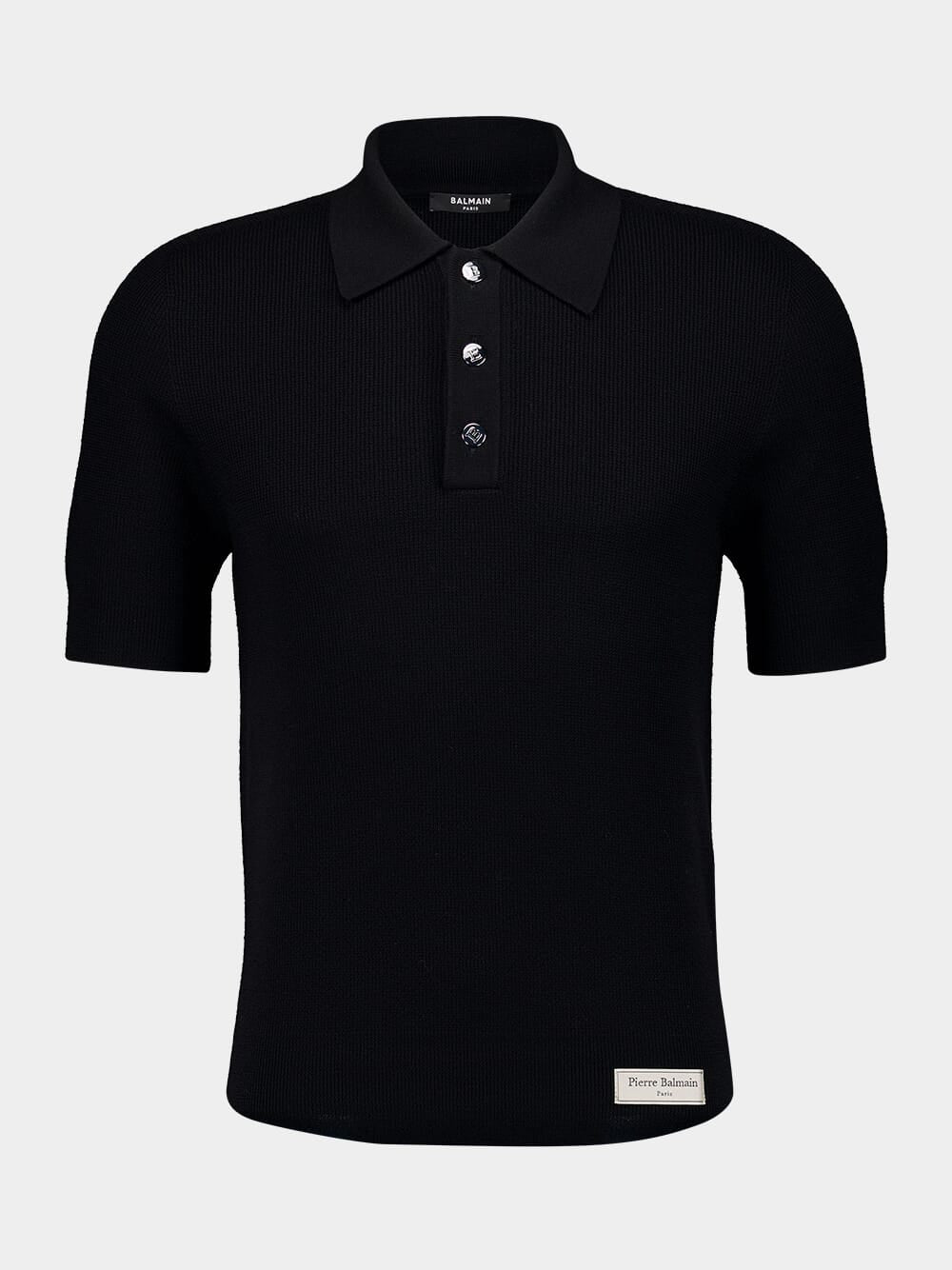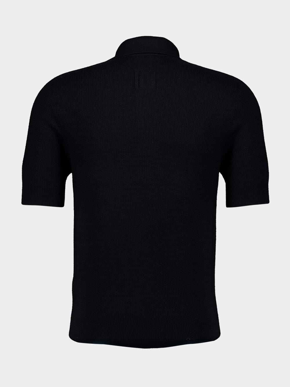 This sophisticated black polo shirt is crafted from high-quality merino wool, ensuring both comfort and style. It features a classic polo collar, short sleeves, and a three-button placket, making it an ideal choice for both casual and semi-formal occasions. The fine wool fabric provides a soft and breathable feel, perfect for any season. The subtle branding near the hem adds a touch of luxury to this timeless piece.