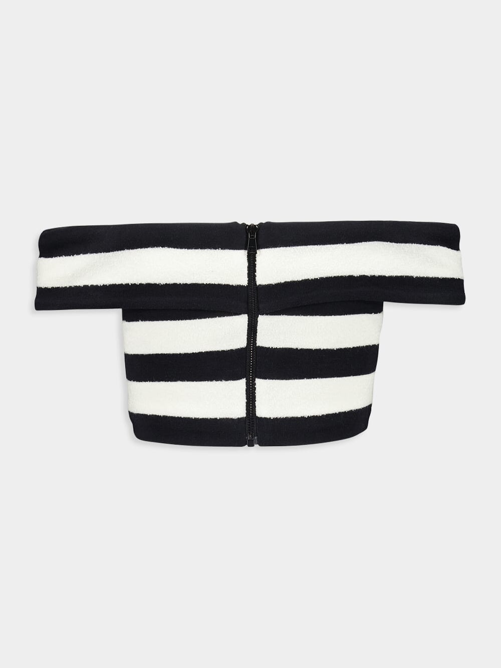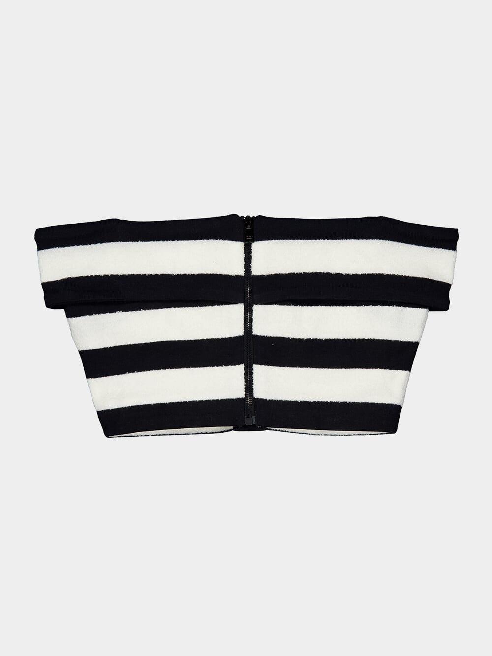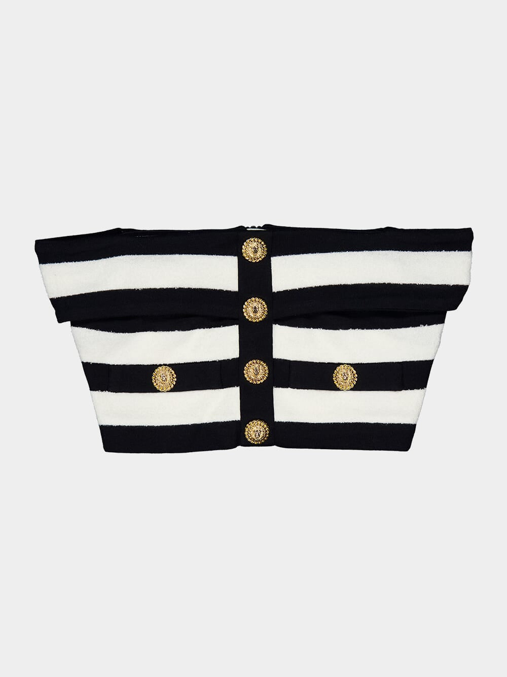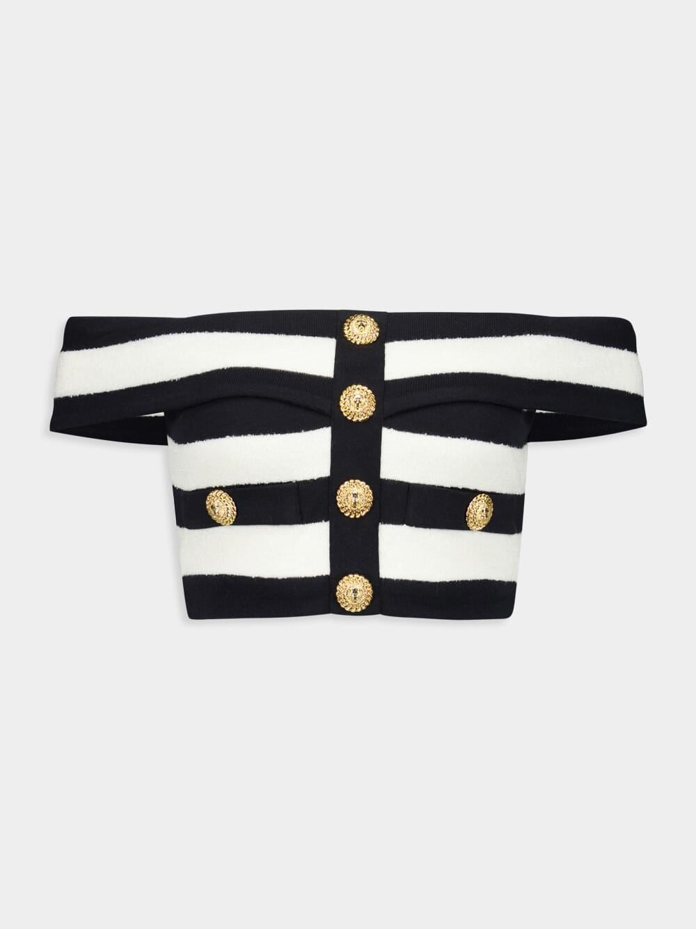 This off-shoulder striped top in black and white exudes a chic and modern style. Made from a cotton blend, it features a horizontal stripe pattern and embossed gold-tone buttons for a touch of elegance. The off-shoulder design with short sleeves adds a flattering and trendy element, while the cropped length makes it perfect for pairing with high-waisted bottoms. Ideal for warm weather, this top can be dressed up or down for various occasions.