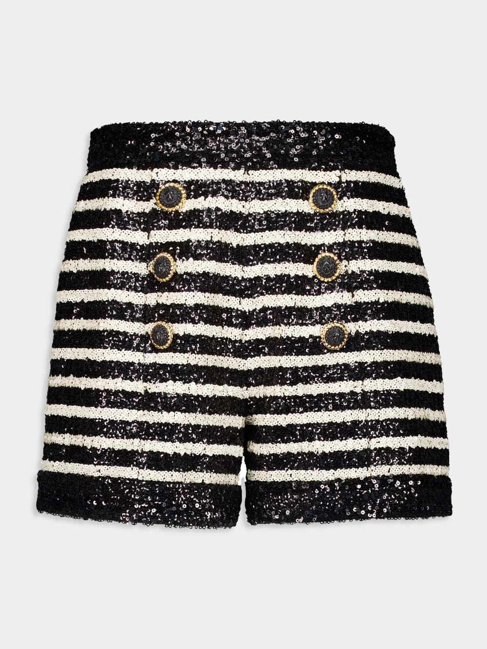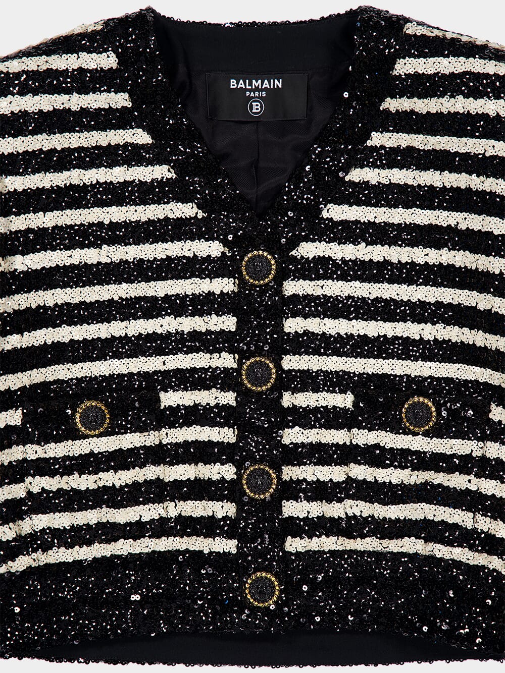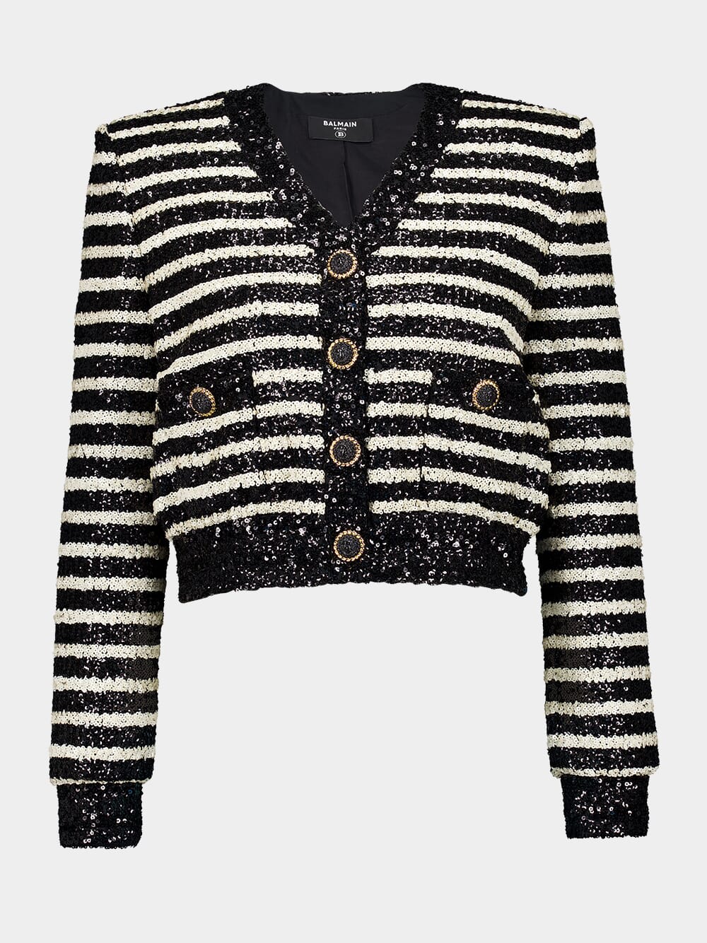 This striped sequinned jacket from Balmain features a dazzling sequin embellishment and a bold horizontal stripe pattern. The V-neck design, shoulder pads, and long sleeves create a striking silhouette. With two side welt pockets and front press-stud fastening, this cropped jacket is both functional and stylish. The straight hem adds a polished finish. Perfect for adding a touch of glamour to any evening ensemble.