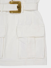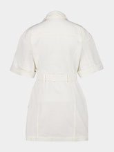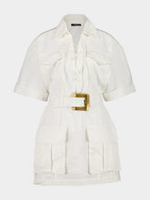 Crafted in crisp white cotton canvas, this short lace-up dress combines utilitarian elements with feminine structure. Featuring a shirt collar, adjustable lace-up neckline, flap breast pockets, and oversized bellows pockets, it’s completed with a detachable belt showcasing a golden PB-engraved Anthem buckle. The cropped silhouette with a fitted waist offers a bold, refined summer look.