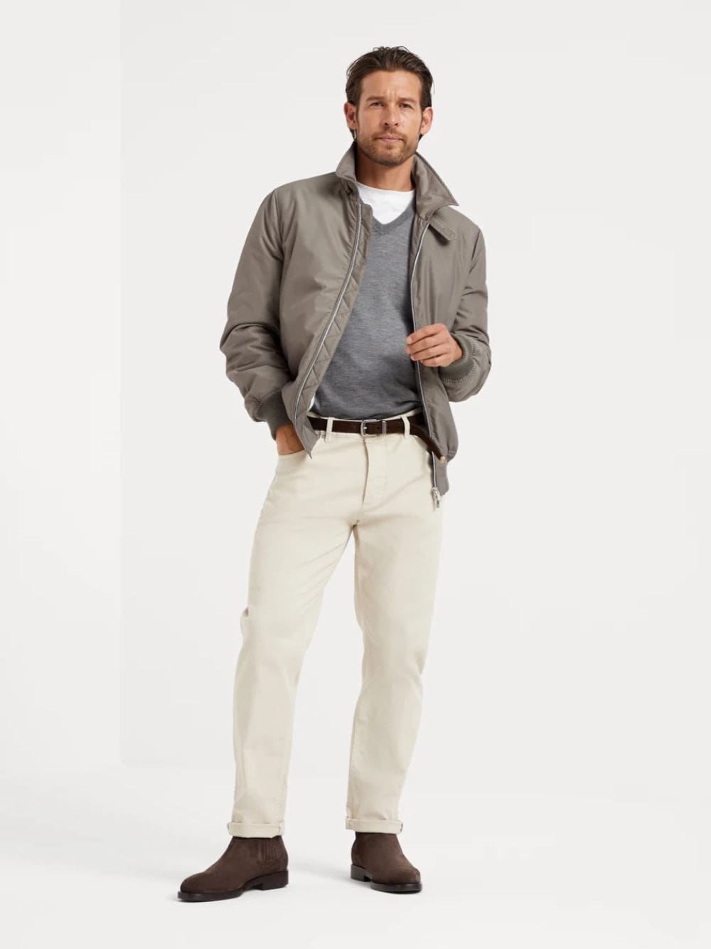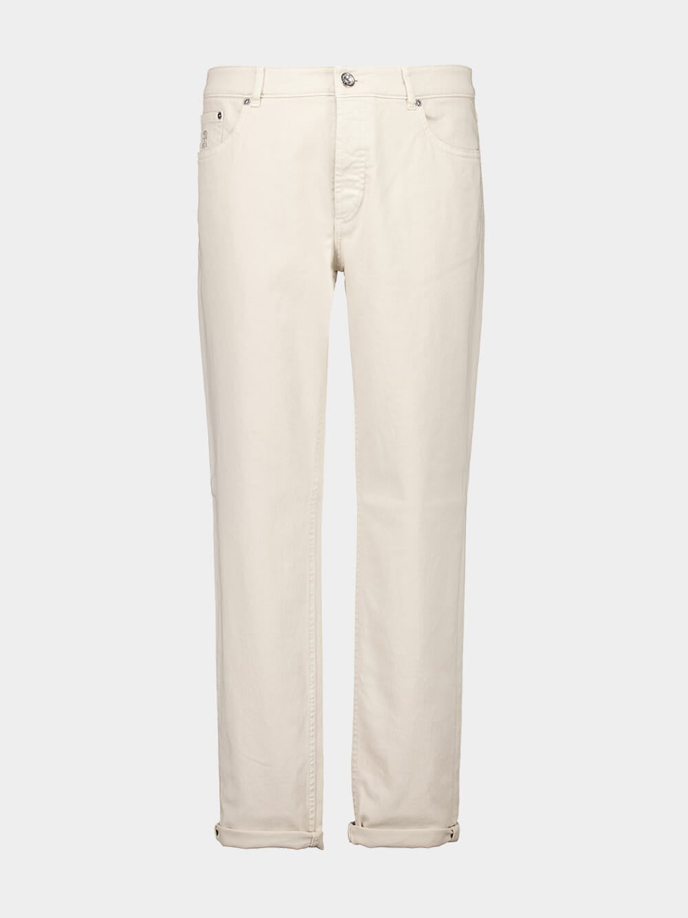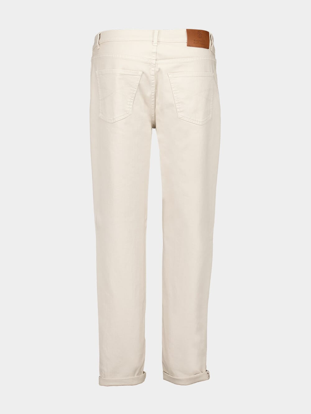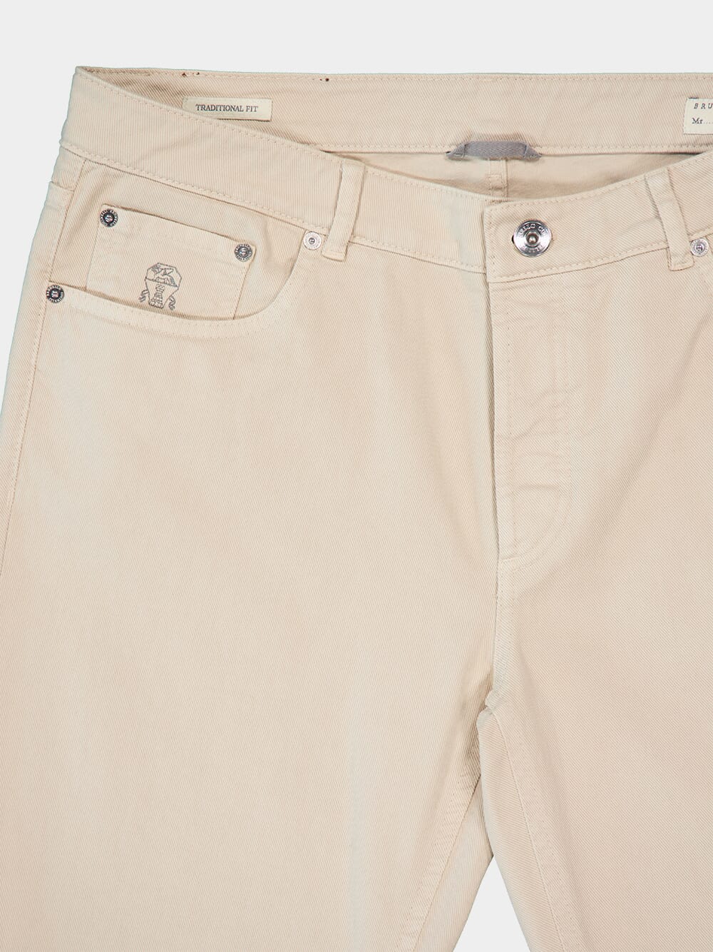 These cream garment-dyed five-pocket trousers, made from lightweight cotton denim with a touch of spandex, offer both comfort and style. The traditional fit features regular lines along the leg, embodying the classic Brunello Cucinelli aesthetic. Garment dyeing adds subtle variations in color, giving the pants a distinct character. With a comfortable and breathable texture, these trousers are perfect for versatile, everyday wear. Made in Solomeo, Italy, with respect for craftsmanship and ethical production.