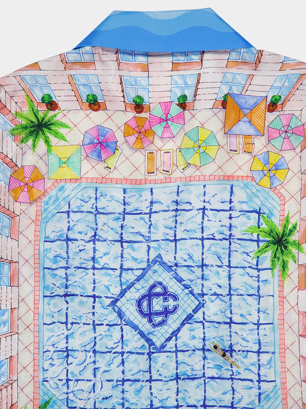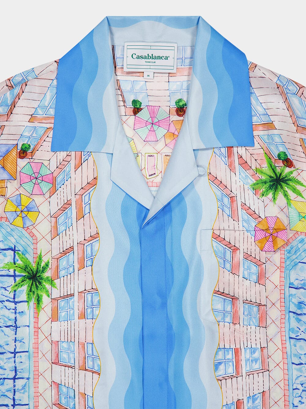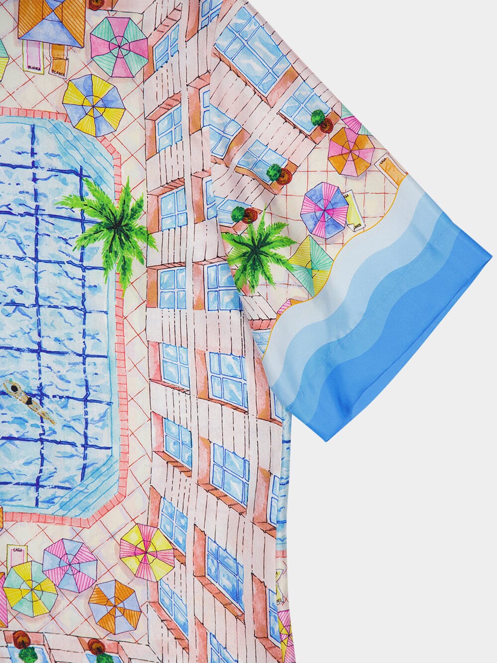 The Le Plongeon silk shirt is a short-sleeve masterpiece crafted from luxurious silk twill. It features a vibrant print inspired by a picturesque day at a hotel's swimming pool, viewed from above. The light and idealistic color palette of soft pastels captures the essence of travel and relaxation. This shirt is completed with a front button closure, a Cuban collar, a breast pocket, and contrasting Memphis wave-inspired gradient stripe details on the cuffs, collar, hem, and placket. Perfect for adding a touch of elegance to your summer wardrobe.
