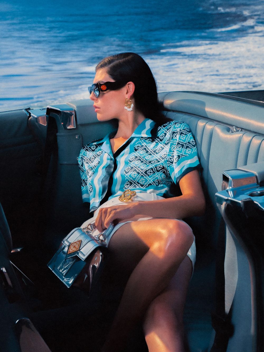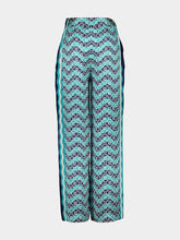 The Monogram Wave silk trousers are a striking wide-leg style crafted from luxurious silk satin. Featuring the house's iconic monogram print in turquoise and blue, they are adorned with horizontal Memphis-wave accents and bold vertical stripes down the sides. Designed with slanted side pockets and a fluid silhouette, these trousers exude refined elegance with a playful, summery twist.