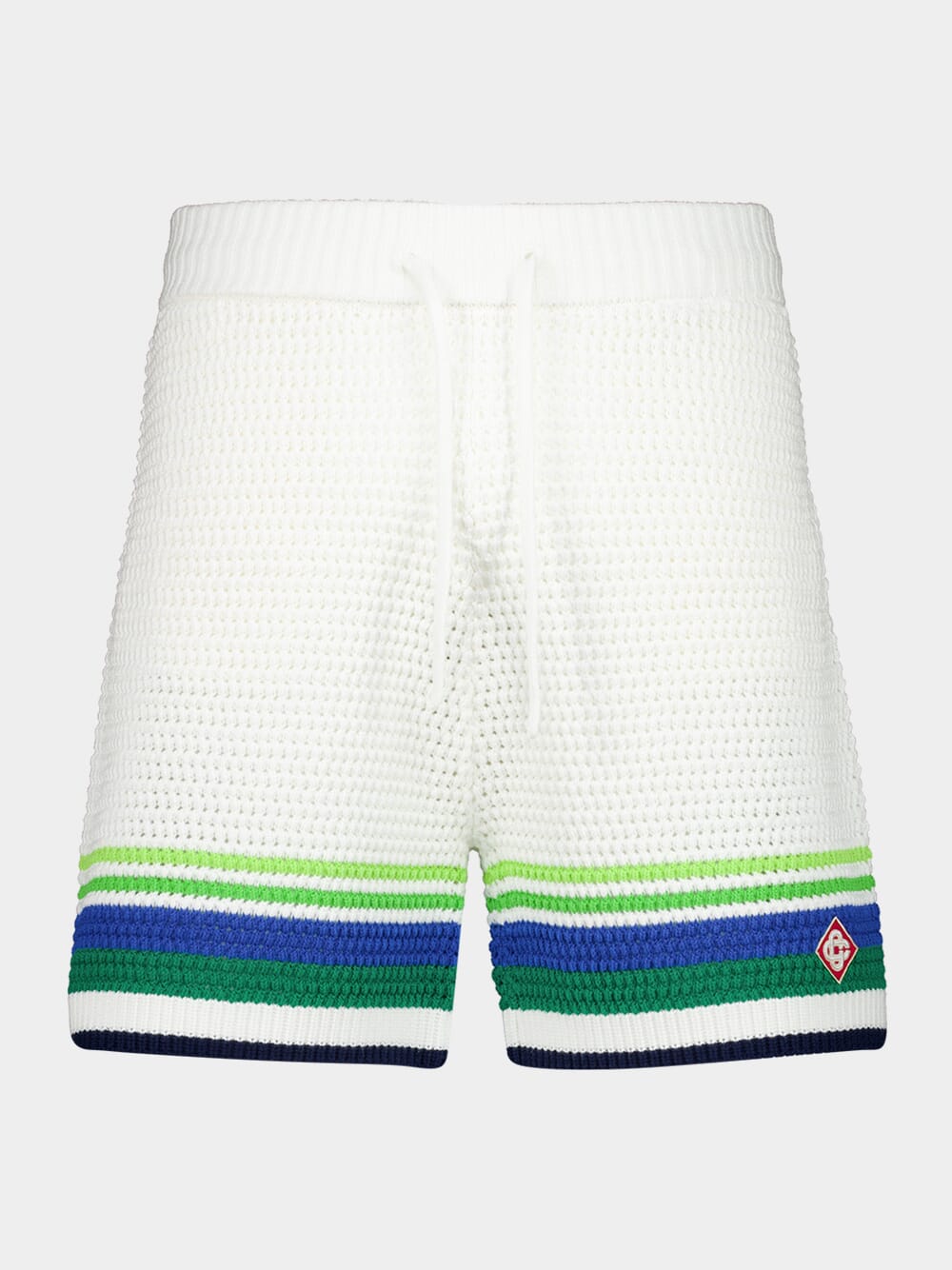 This short sleeve shirt is crafted in a breathable cotton knit with a bold striped design across the shoulders and sleeves in shades of blue and green. Featuring a ribbed collar, hem, and cuffs for added structure, it’s finished with pearl-effect gold rim buttons and two front patch pockets. The relaxed silhouette captures Casablanca’s refined take on retro-inspired sportswear.