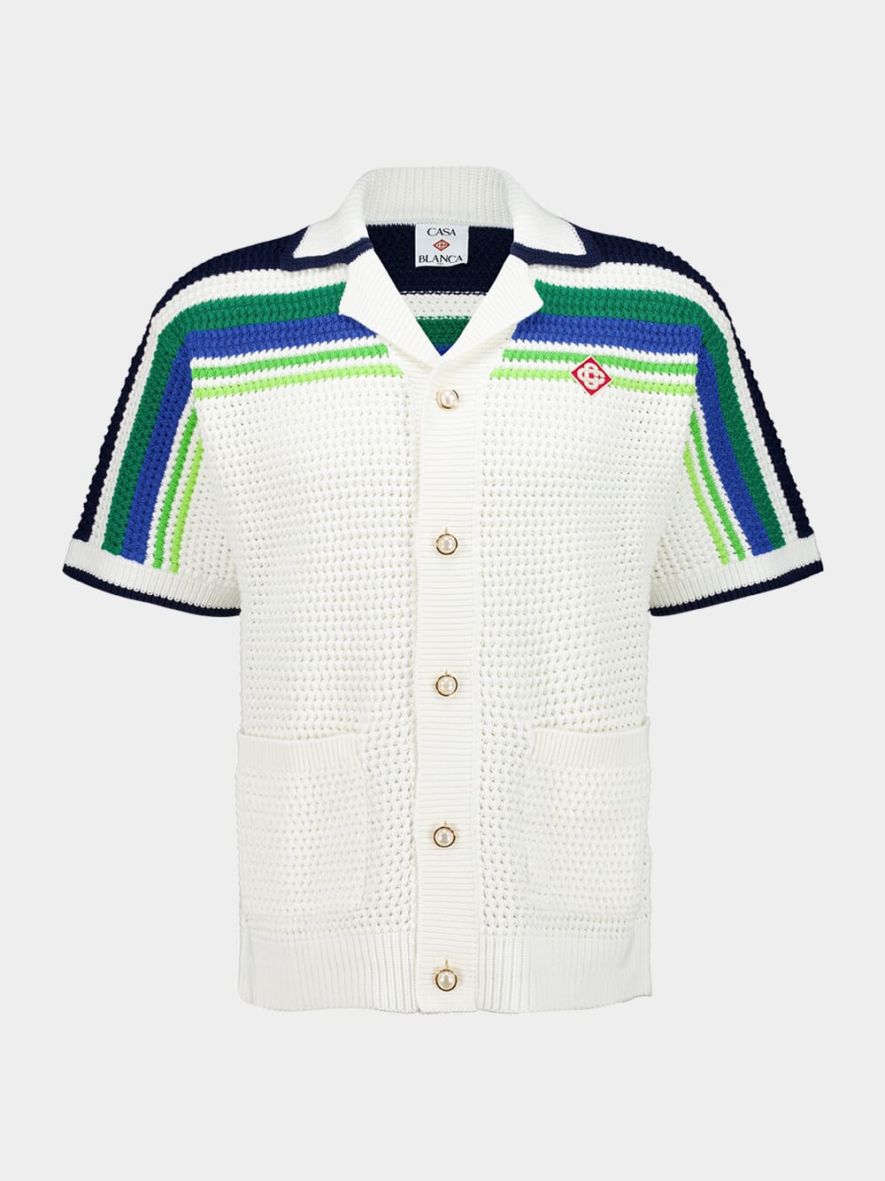 These Casablanca shorts are crafted from soft cotton with a textured knit finish, featuring elegant green, blue, and navy horizontal stripes along the hem. The crisp white base is complemented by a comfortable drawstring waistband and refined tailoring. Ideal for leisure or resort wear, they embody relaxed sophistication with a sporty twist.