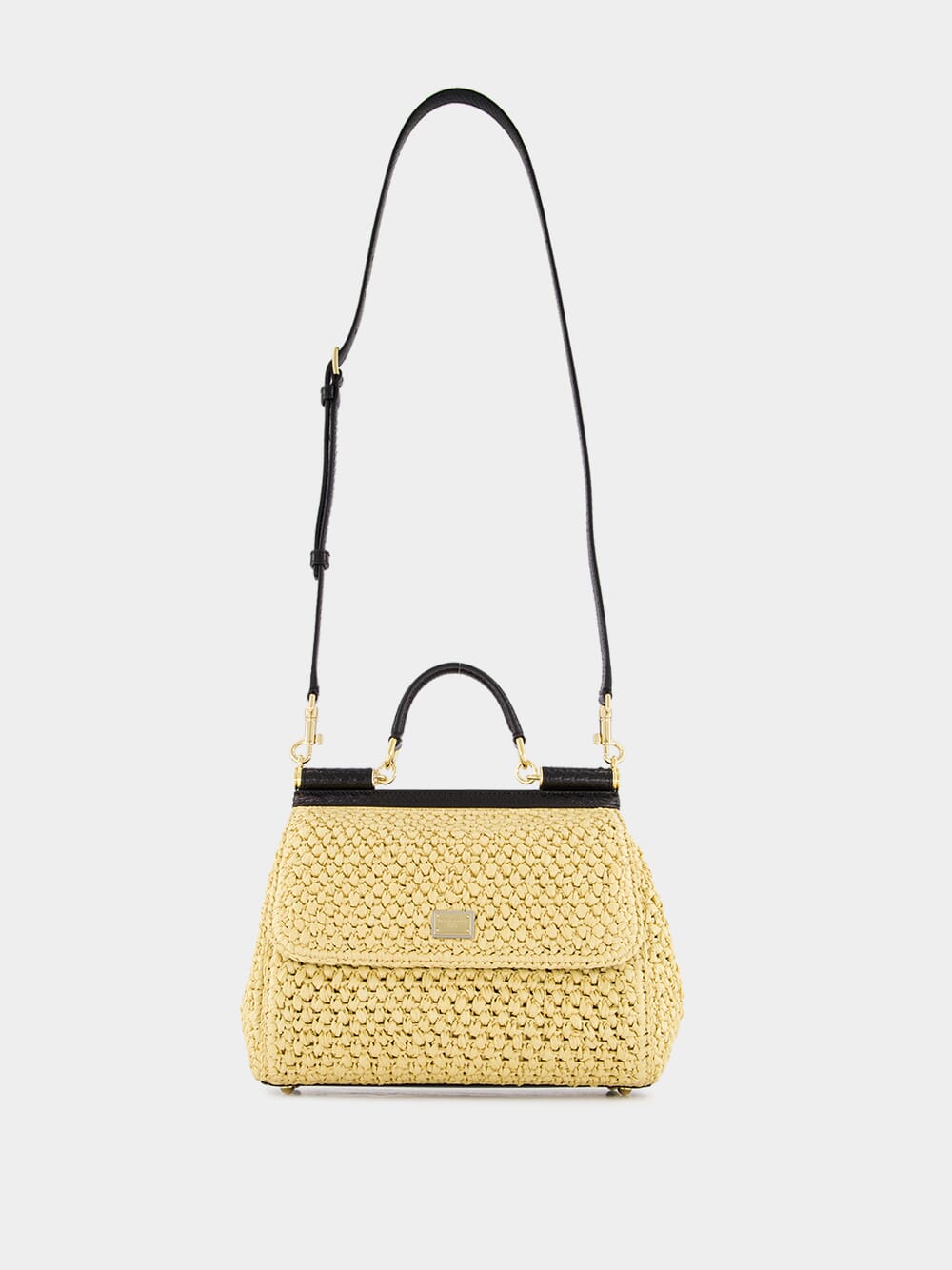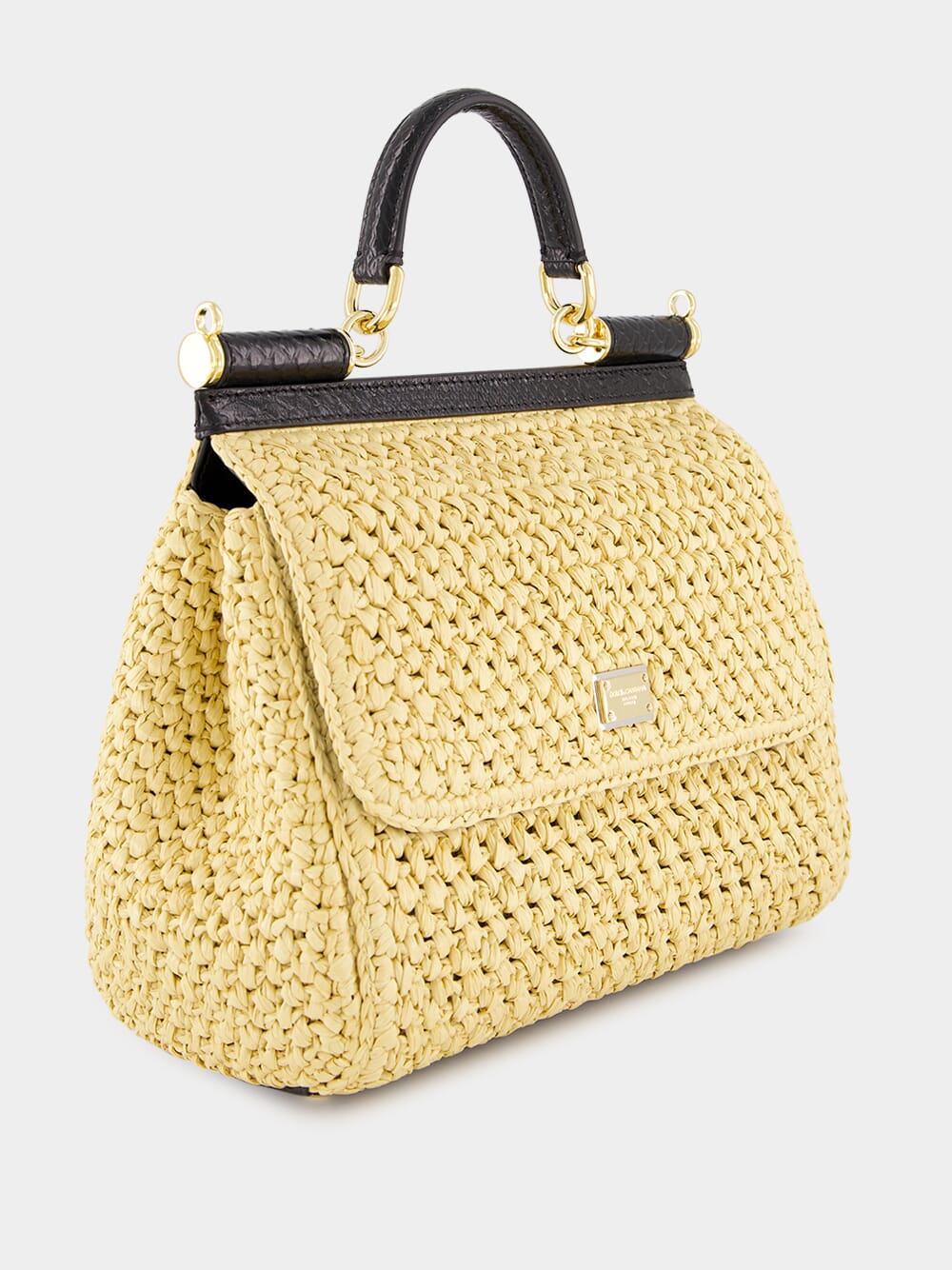 A brand icon, this large Sicily handbag is crafted from beige crochet raffia, offering a practical yet stylish way to carry your essentials. It features a front flap with hidden double magnetic fastening, a branded tag with two metal plated finishes, and a top handle. The adjustable, detachable crossbody strap in python skin adds versatility. Inside, the bag is lined with fabric and includes an inner pocket with branded zipper, a card compartment, and a flat pocket. Metal feet studs on the base provide added durability.