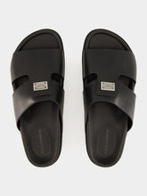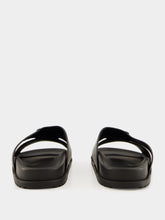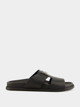 These black calfskin slide sandals offer a sleek, sophisticated design perfect for refined summer styling. Crafted in Italy, they feature a supple leather upper, polyurethane insole wrapped in calf leather, and a lightweight EVA outsole. Enhanced with palladium and ruthenium-plated tag detailing, this versatile pair blends elegance with comfort. Presented in a black cotton bag and embossed box for a luxurious finishing touch.