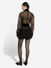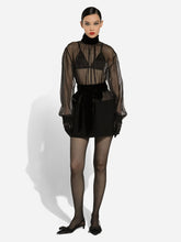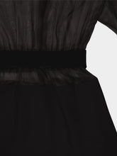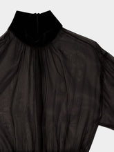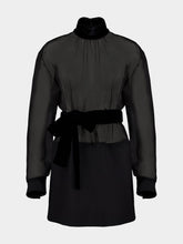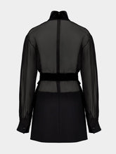 Elevate your wardrobe with this refined black short dress, expertly crafted from luxurious wool crepe and silk organza. Designed with a high velvet neckline, long organza sleeves finished with structured wool cuffs, and a belted waist that accentuates your silhouette. The unlined design adds an airy elegance, while the rear zipper and hook-and-bar fastening ensure a tailored fit. A timeless piece, this dress is perfect for sophisticated occasions, offering a harmonious blend of texture and silhouette. Measures 40 cm from the waist on a size IT 40. Made in Italy.