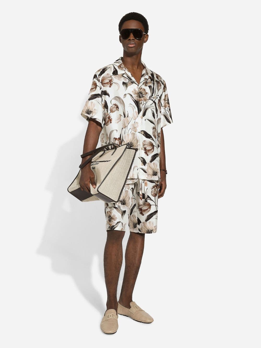 The Palermo collection embodies the connection between the world of the Sicilian man and the island's untouched nature. Characterized by warm tones—sand, cream, and Nero Sicilia black—floral designs, and iconic prints. This collection reimagines Dolce&Gabbana essentials in new materials for a harmonious style. These Silk Hawaiian Shorts with Tulip Print feature a white base, regular fit, stretch waistband with drawstring, front slant pockets, a buttoned patch pocket at the back, and side slits.