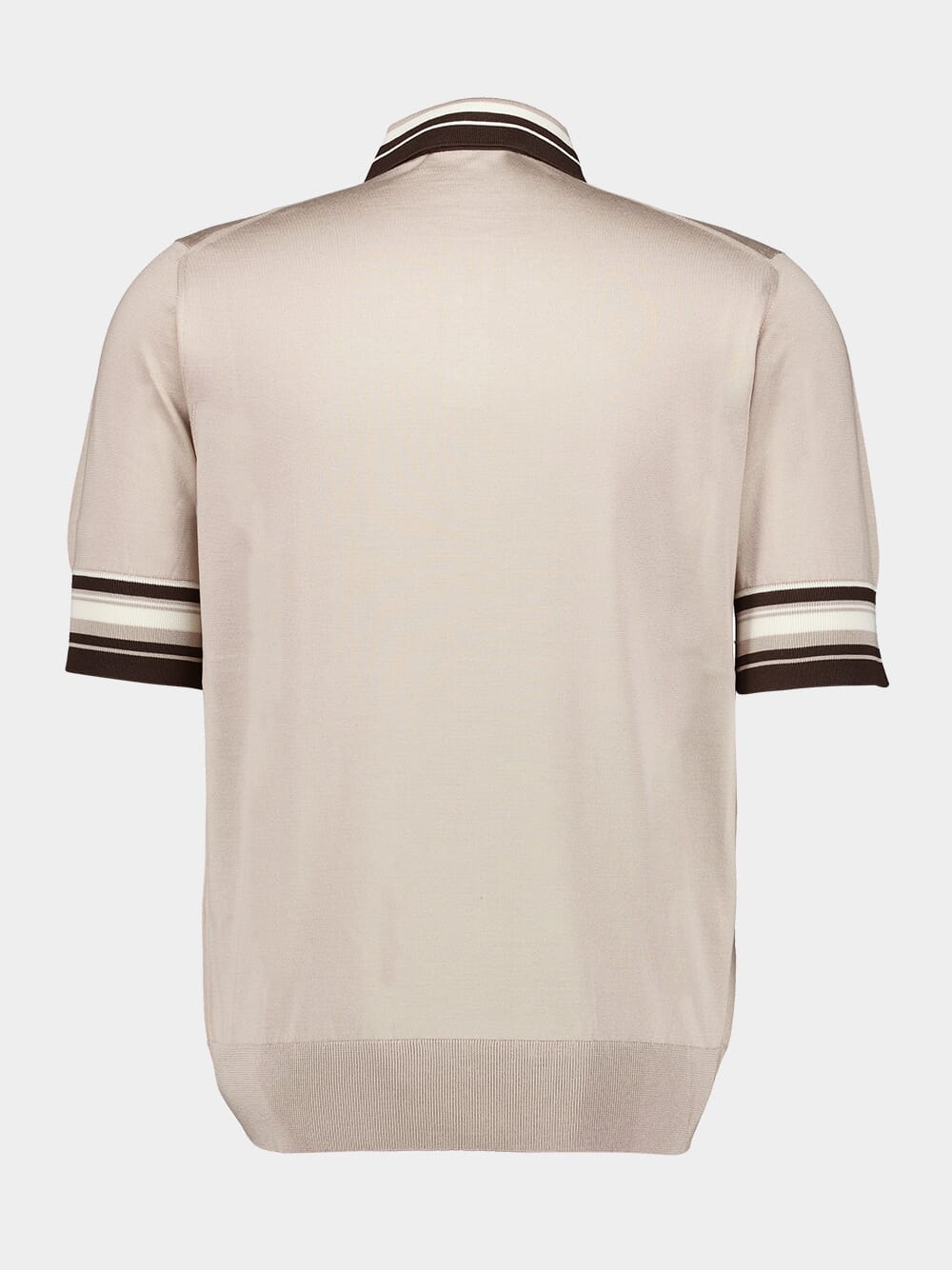 This beige silk polo shirt from the Palermo collection by Dolce&Gabbana exemplifies the connection between the Sicilian man's world and the island's untouched nature. Featuring a regular fit, it is adorned with the DG logo embroidery. The collar and cuffs are accented with contrasting stripes, inspired by vintage mattress designs from the 1940s and 1950s. With button fastenings and short sleeves, this 14-gauge knit polo offers a timeless and sophisticated aesthetic.
