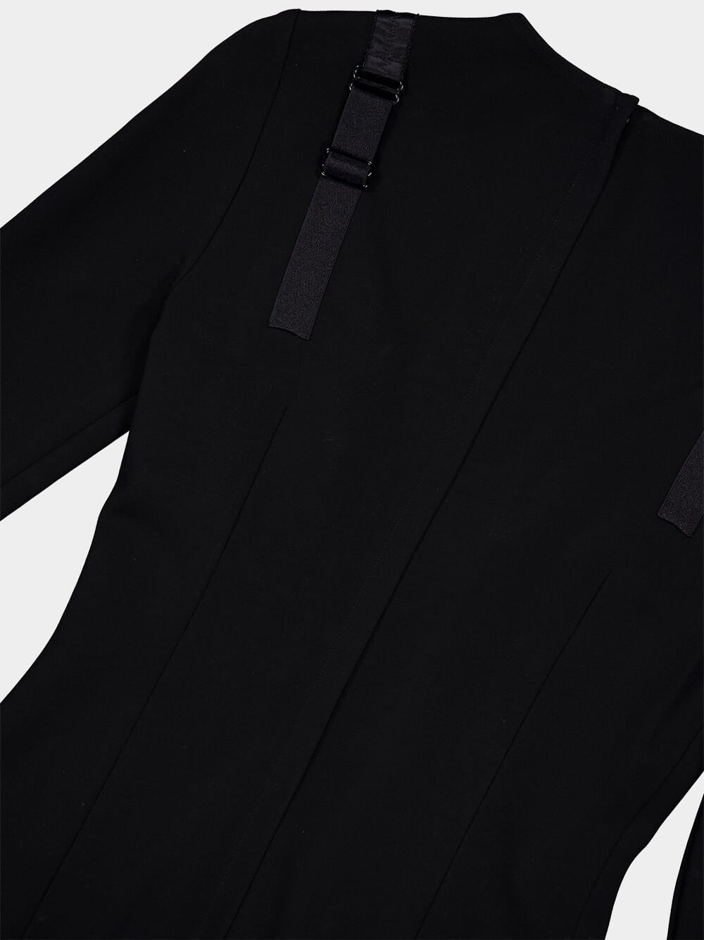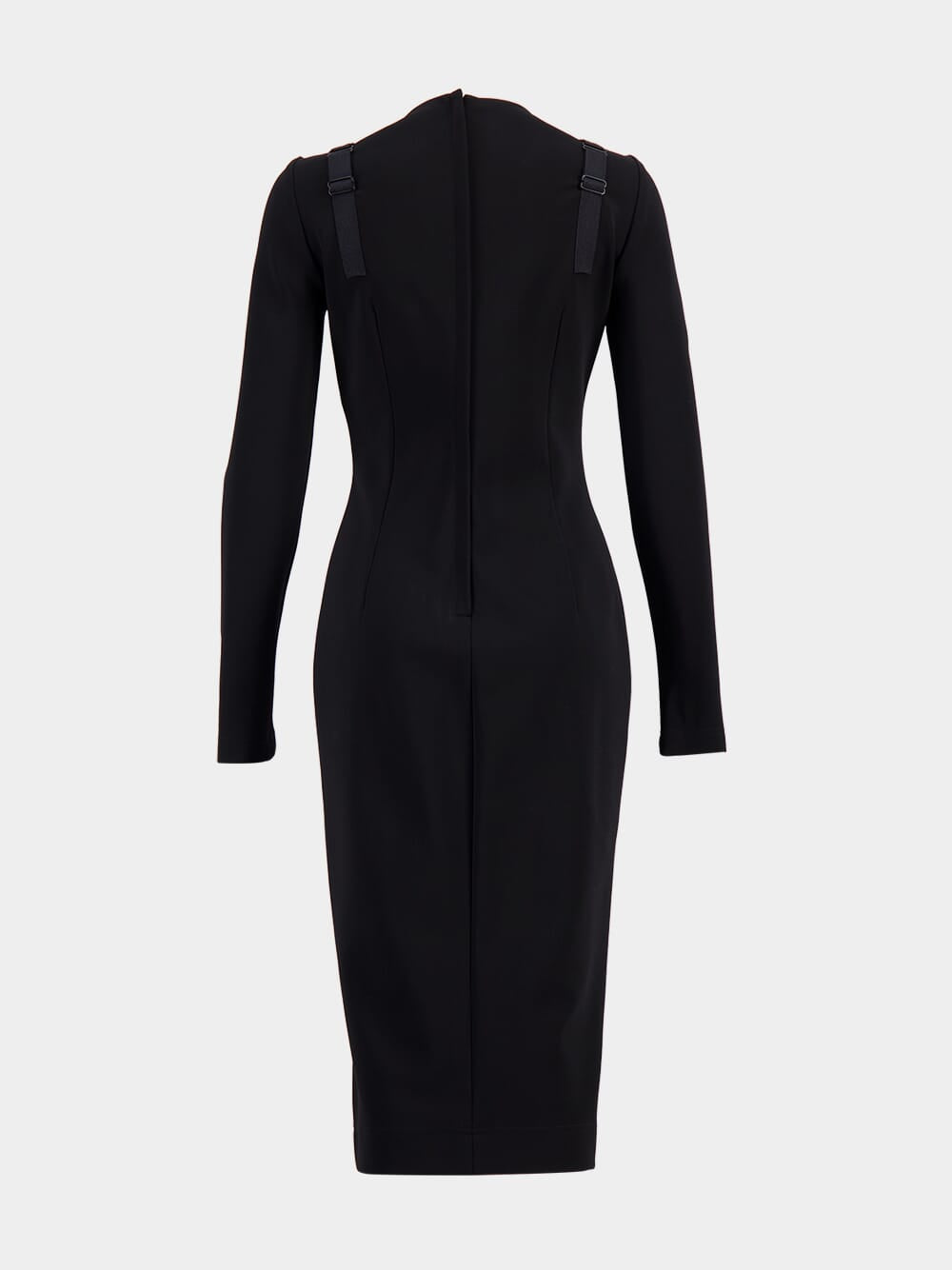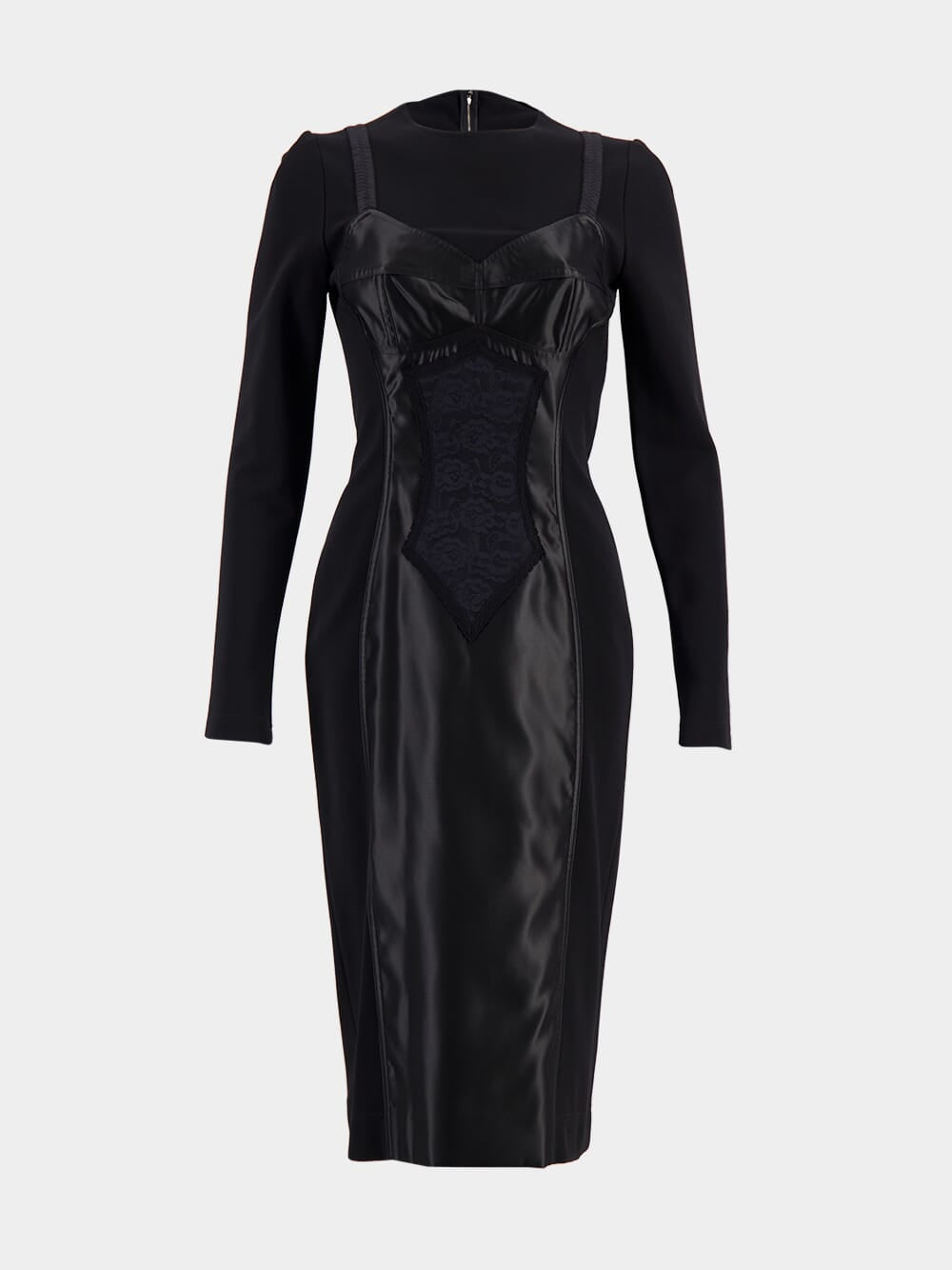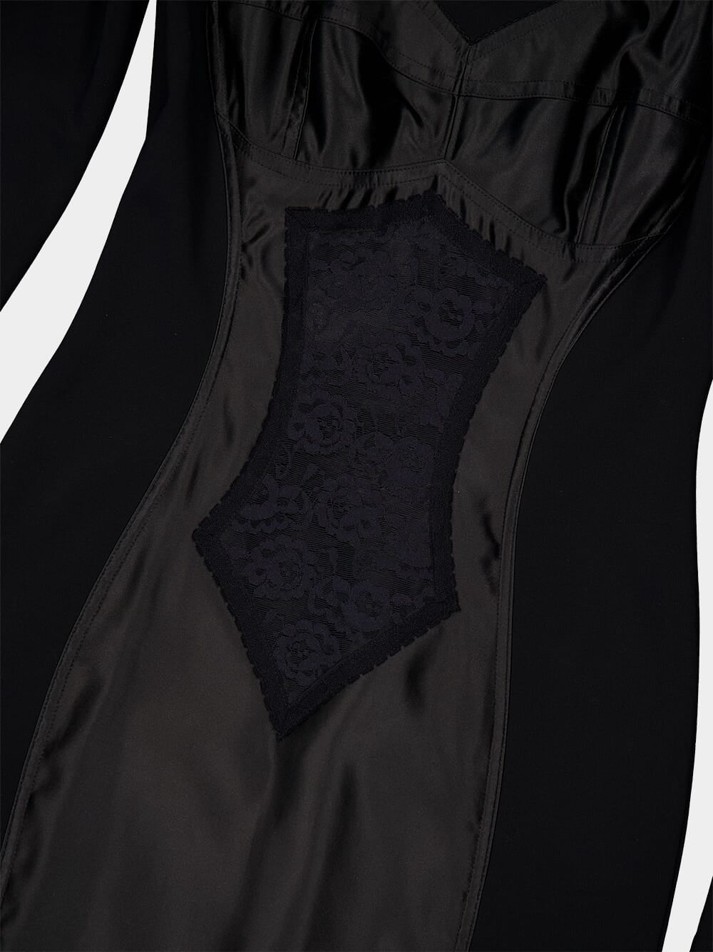 A captivating black midi dress featuring long sleeves, a round neckline, and a delicate silk lingerie-inspired insert at the front. Fastened with a zip and hook at the back, this dress embodies sensual elegance and sophistication, perfect for evening occasions or a refined formal look.