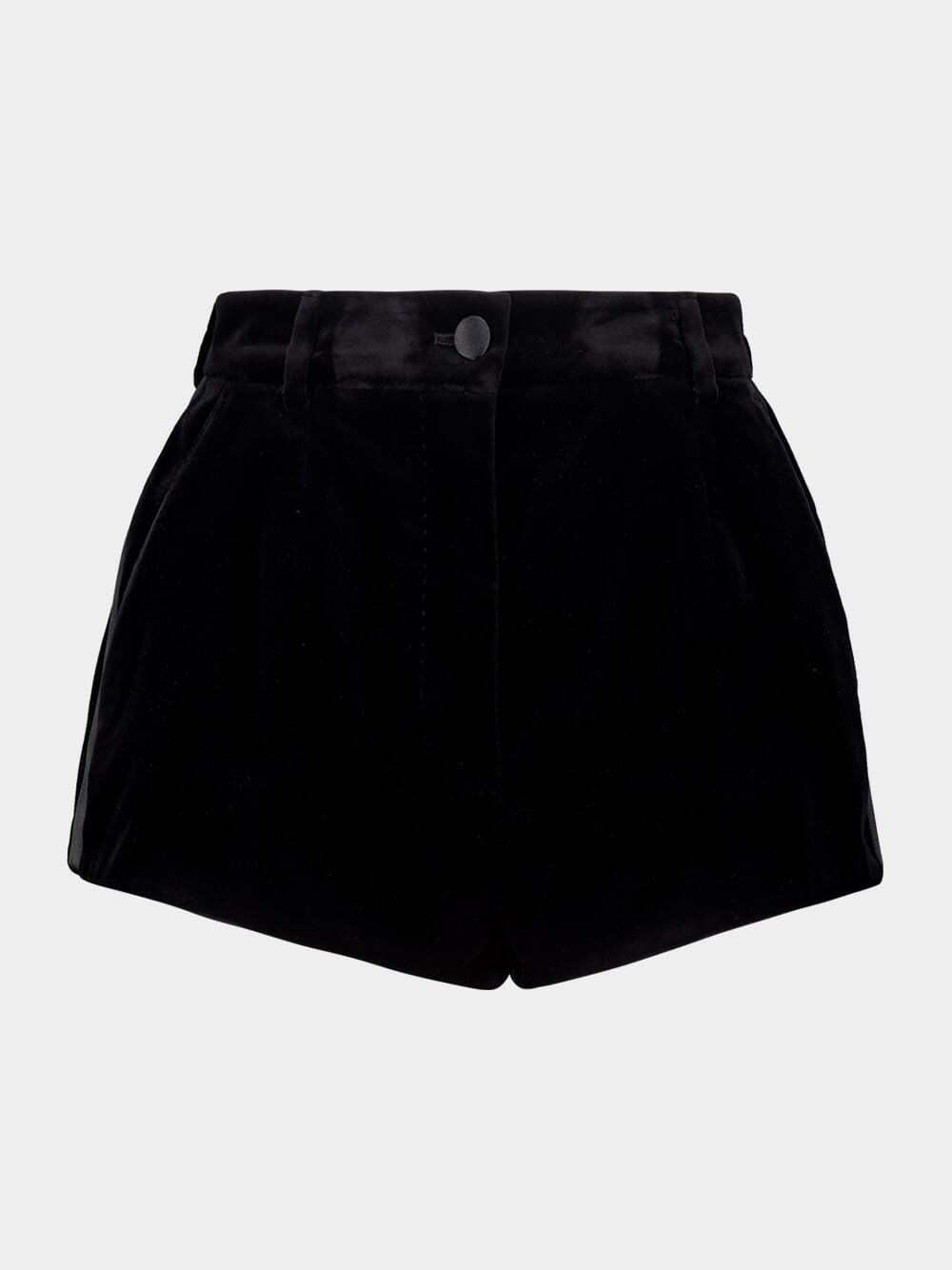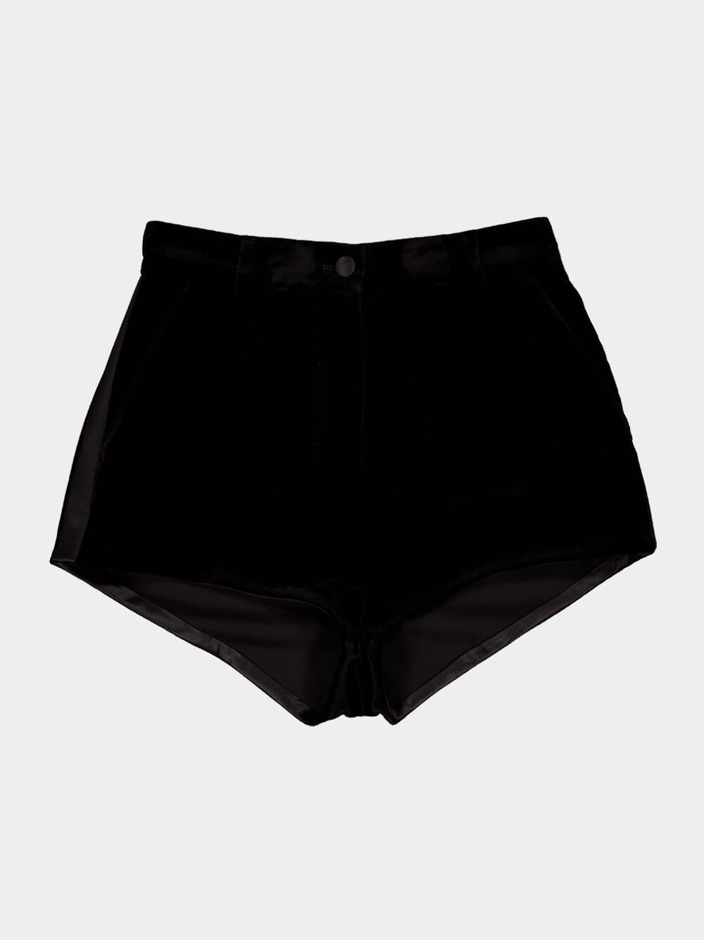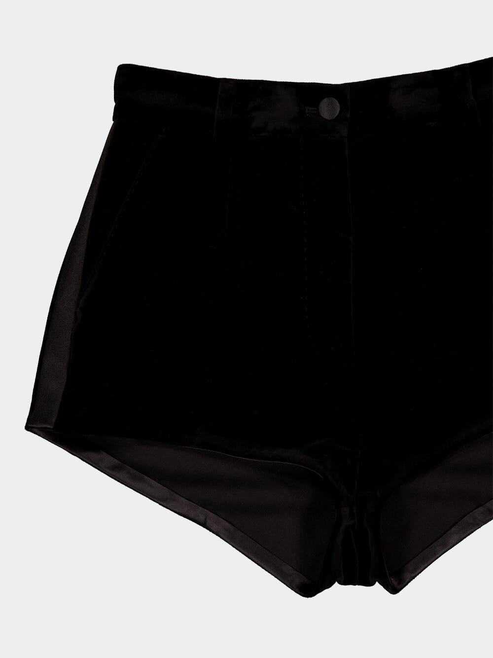 These black high-waisted tuxedo panties are crafted in luxurious cotton velvet, blending sophistication with bold, contemporary style. Designed with a flattering high waist and tailored detailing, these panties feature slant pockets and a front zipper with button fastening, adding a chic tuxedo-inspired touch. Perfect as a statement piece or layering element, this garment embodies Dolce & Gabbana's mastery in combining menswear influences with timeless feminine allure.