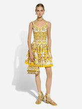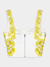 The Majolica, a symbol of Italian craftsmanship, comes in lemon yellow for the FW24/25 Girl’s Collection. This vibrant hue, brightened by pure white, evokes summer light dancing on quintessential Sicilian homes by the sea. Evocative color detailing adds a bold edge to iconic accessories and pieces that are extraordinarily feminine and vibrant. A tribute to majolica art, once again enhancing Dolce&Gabbana's aesthetic rules. This cotton poplin corset top features a majolica print, sweetheart neckline, sleeveless design with shoulder straps, lined interior, elasticated marquisette back, and zipper with hook-and-eye fastening.