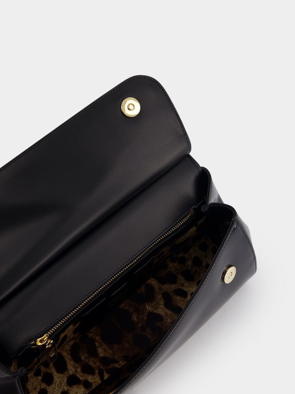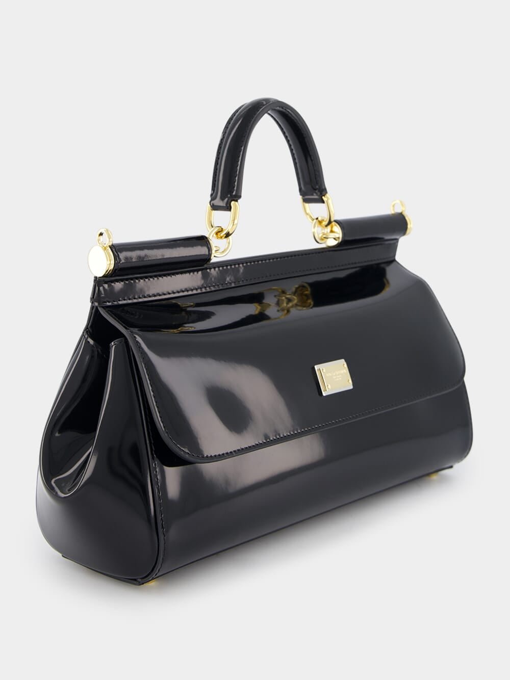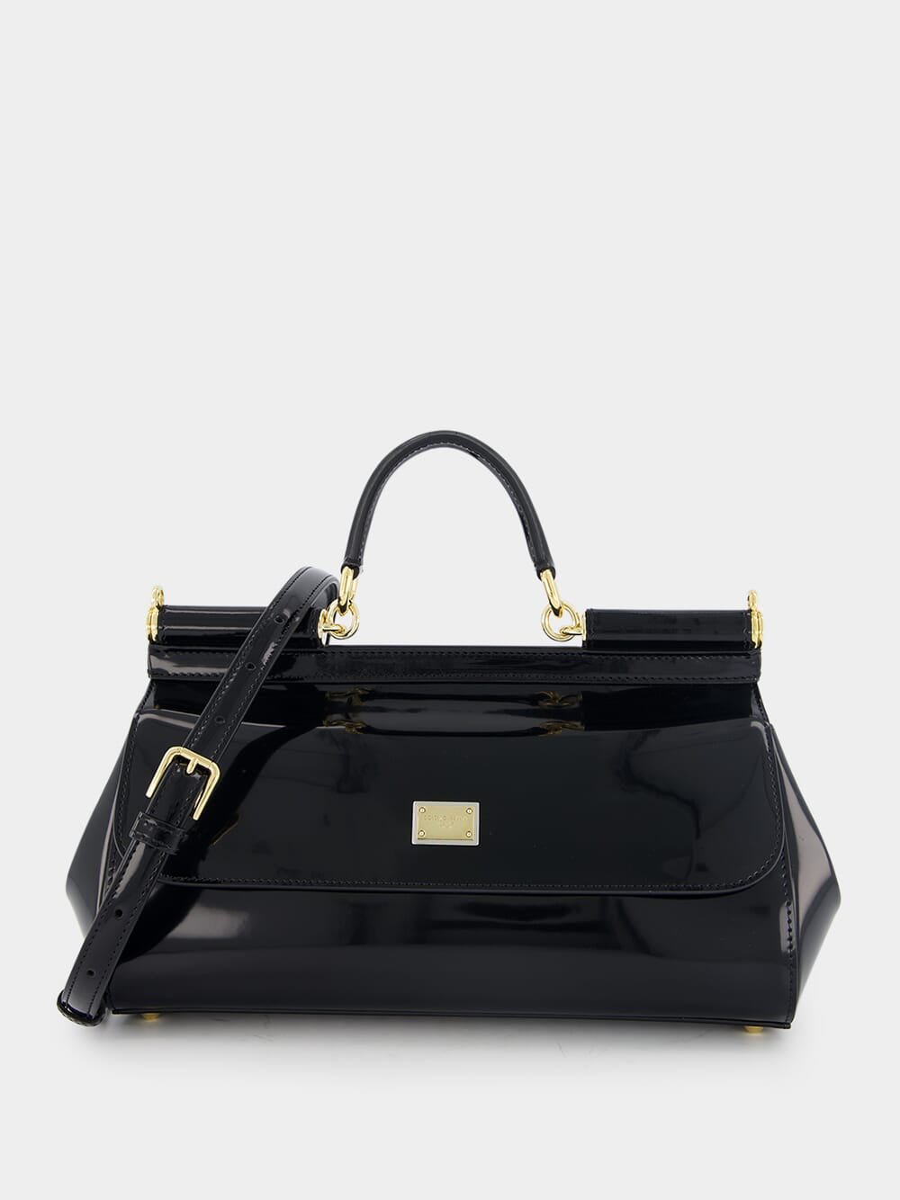 Elongated Sicily Handbag, with a front flap that boasts a concealed double magnetic fastening, ensuring both security and seamless design. Admire the signature logo tag embellished with two exquisite metal plating finishes, embodying luxury. Experience unparalleled versatility with a top handle and adjustable, detachable strap in polished calfskin. The printed fabric lining, accompanied by a flat pocket, adds a touch of sophistication. Your coveted piece arrives impeccably presented with a branded dust bag.