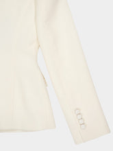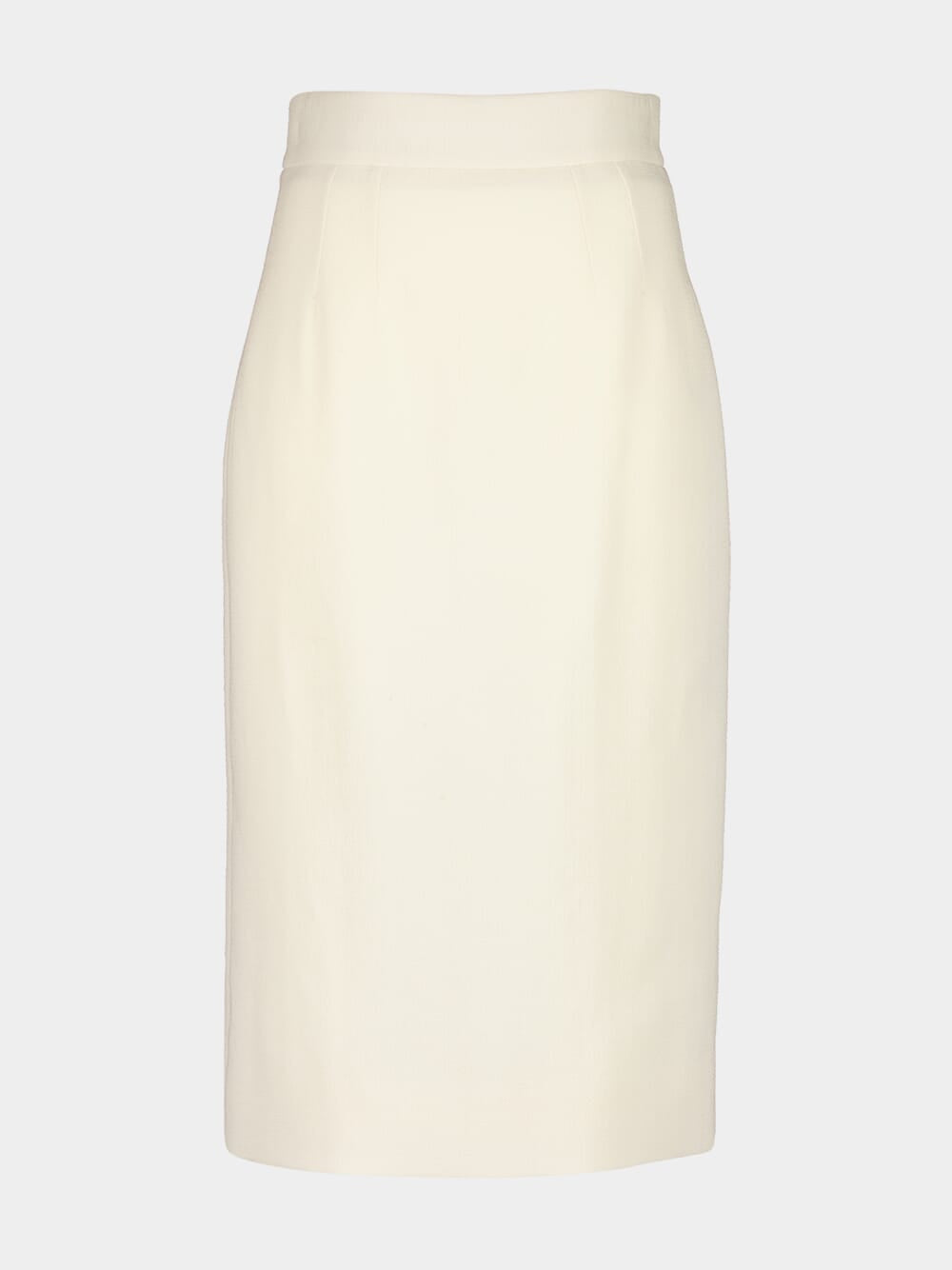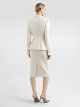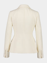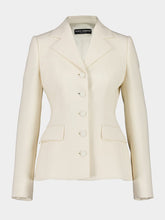 This white Dolce jacket in double crêpe by Dolce & Gabbana embodies timeless elegance and precise tailoring. Crafted in Italy from 100% virgin wool, it features notch lapels, covered buttons, and welt pockets with flaps. The structured silhouette is enhanced by side wadding and a hemp basque, while the silk-blend lining offers comfort and refinement. A quintessential piece for elevated sophistication.