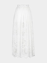 A timeless piece from the Dolce&Gabbana FW24/25 Capri Collection, this long circle skirt is crafted from white cotton poplin with intricate cut-out embroidery. High-waisted and unlined for effortless elegance, its flowing silhouette echoes the sophistication of 1960s Italian summers. The skirt fastens at the back with a discreet zipper and hook-and-eye closure, making it ideal for refined daywear or resort chic looks.