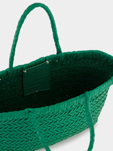 The "Mini Flat Gora" bag in kelly green is a beautifully handcrafted piece made from buffalo calf leather. Celebrated for its intricate weave and lightweight structure, this mini bag reflects traditional basket weaving with a contemporary twist. Its compact size is perfect for carrying essentials, making it versatile for both casual outings and elevated occasions. Inside, an antiqued St. Christopher medal charm, a tribute to the patron saint of travelers, is hand-sewn as Dragon Diffusion's mark of authenticity.