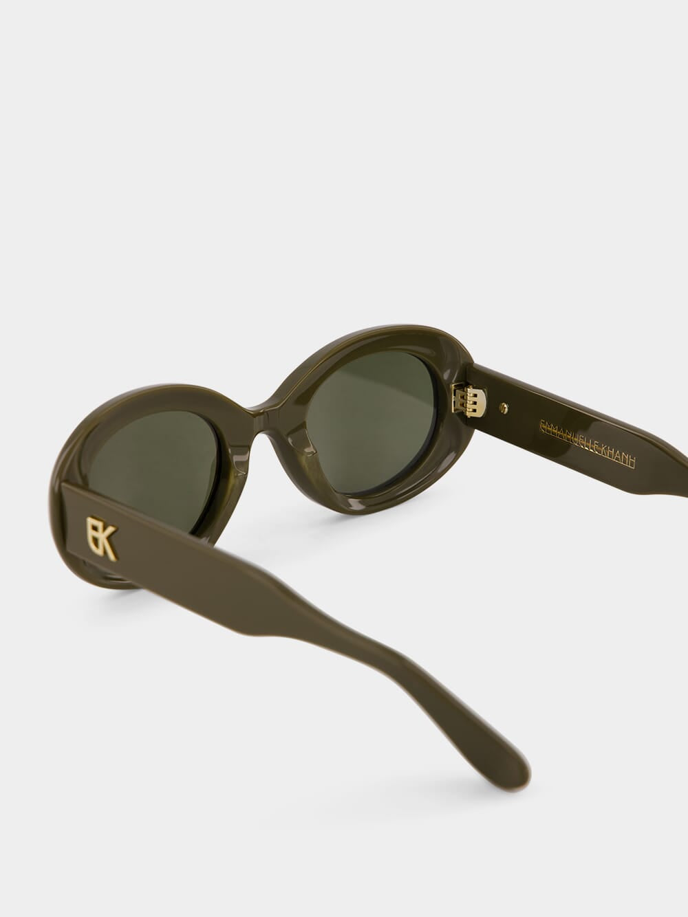 These Emmanuelle Khanh olive green queen sunglasses exude retro charm with a modern twist. Crafted from BioNylon for an eco-friendly touch, they feature an oval shape that complements various face shapes. Offering 100% UVA/UVB protection, these sunglasses ensure both style and safety in any sunny setting. Perfect for those who value timeless design with a sustainable edge.