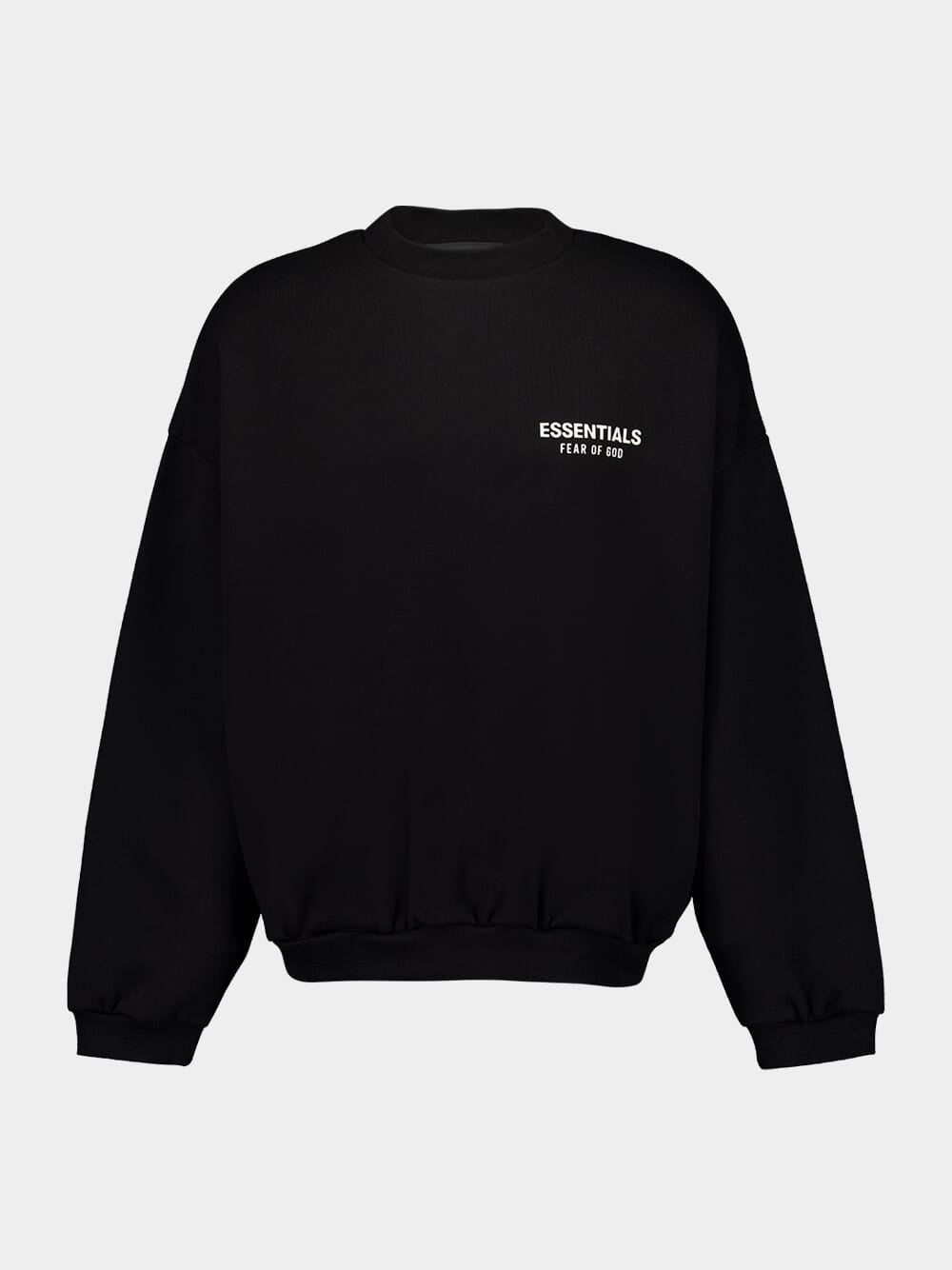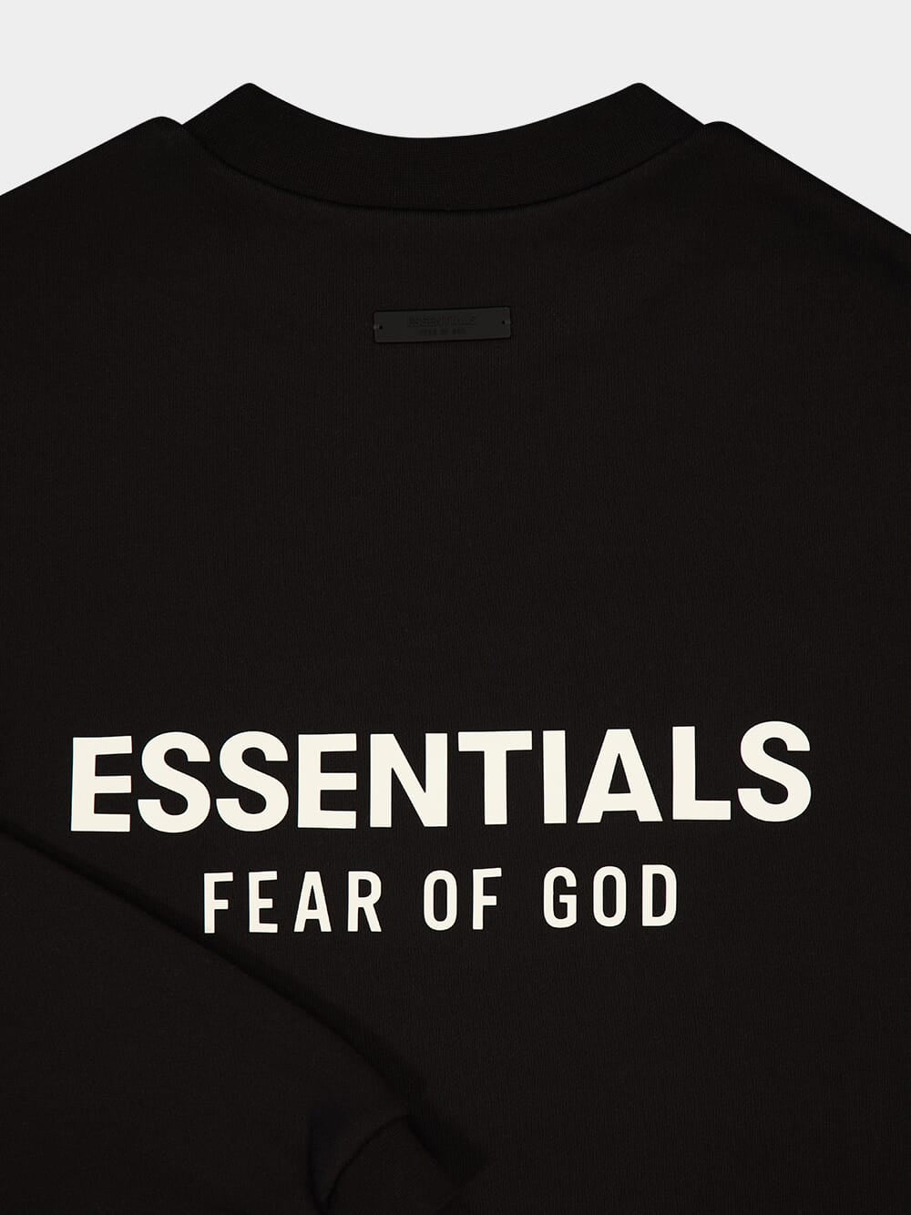 The Black Essentials Fleece Crewneck by Fear of God is crafted from heavy 380gsm core fleece, offering warmth and structure for refined casual wear. It features the signature "Essentials Fear of God" soft-touch logo on the chest and across the back. Additional details include a rib-knit collar, cuffs, and hem for a tailored finish. A rubberized Essentials Fear of God label is positioned at the back collar for a signature touch. This versatile piece is perfect for layering or standalone styling.