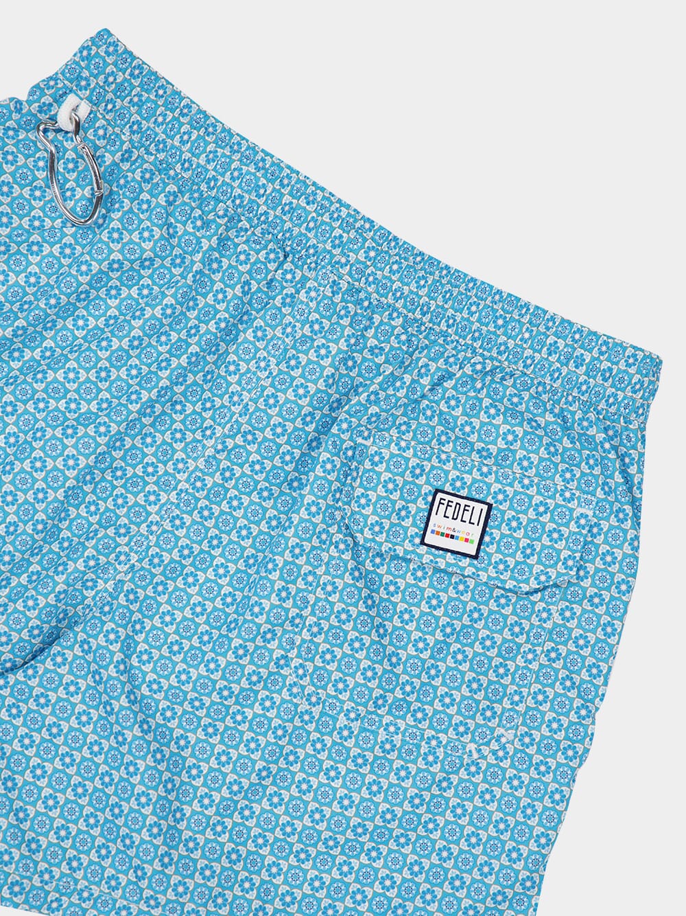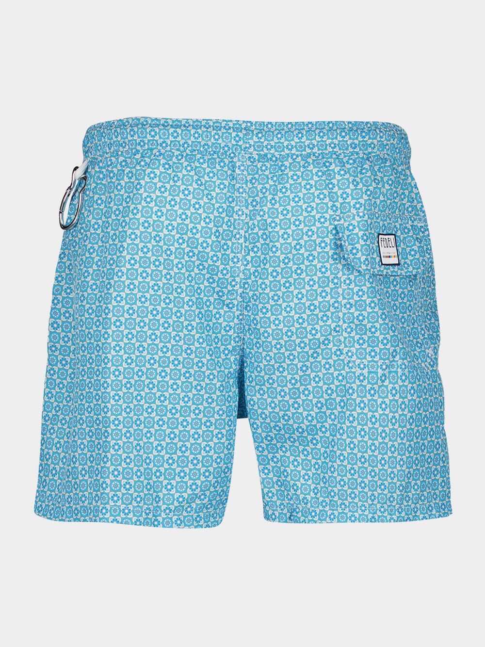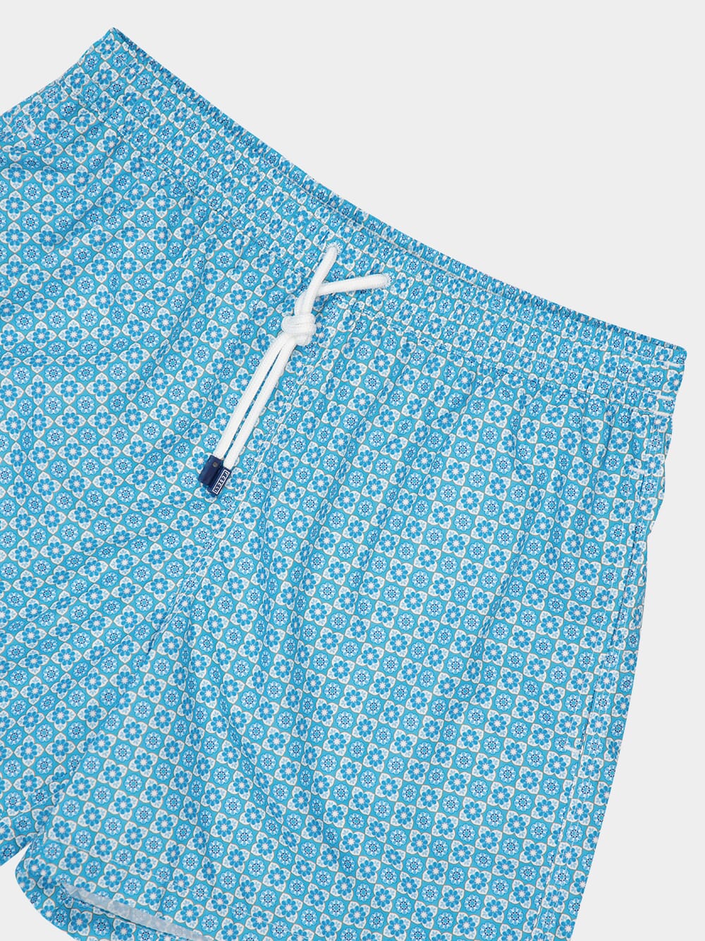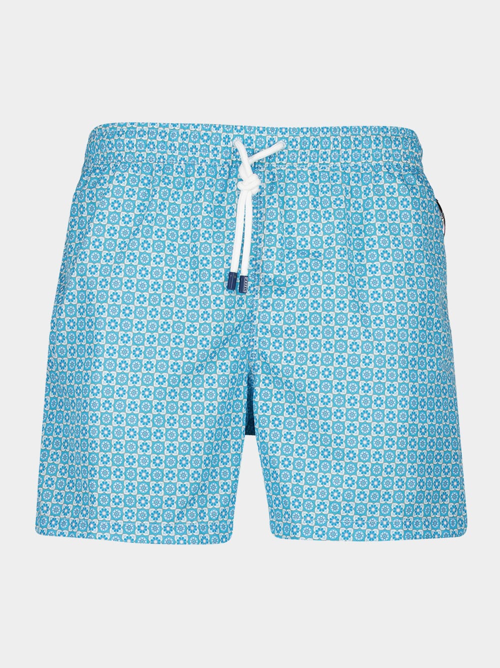 These signature swim shorts, crafted from recycled polyester, feature a vibrant blue geometric pattern for a modern, stylish beach look. Designed for optimal comfort, they are slightly shorter than the classic Positano design, providing freedom of movement. The lightweight fabric ensures quick drying, earning them the name ‘90-seconds trunks’. The elasticated waistband with drawstring provides a perfect fit, while the sustainable material makes them a responsible choice for eco-conscious individuals.