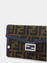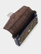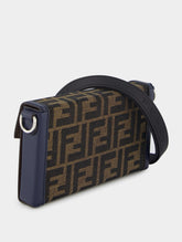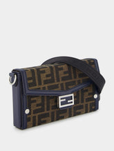 Baguette Soft Trunk Phone Pouch a mini baguette that showcases the iconic jacquard FF motif on fabric. The flap features a magnetic FF clasp for easy access and is elegantly embellished with blue leather accents. With a microfiber lining and palladium-finish metalware, it's a testament to luxury. The adjustable and detachable tech fabric cross-body shoulder strap, complete with FENDI lettering, offers versatility and comfort.