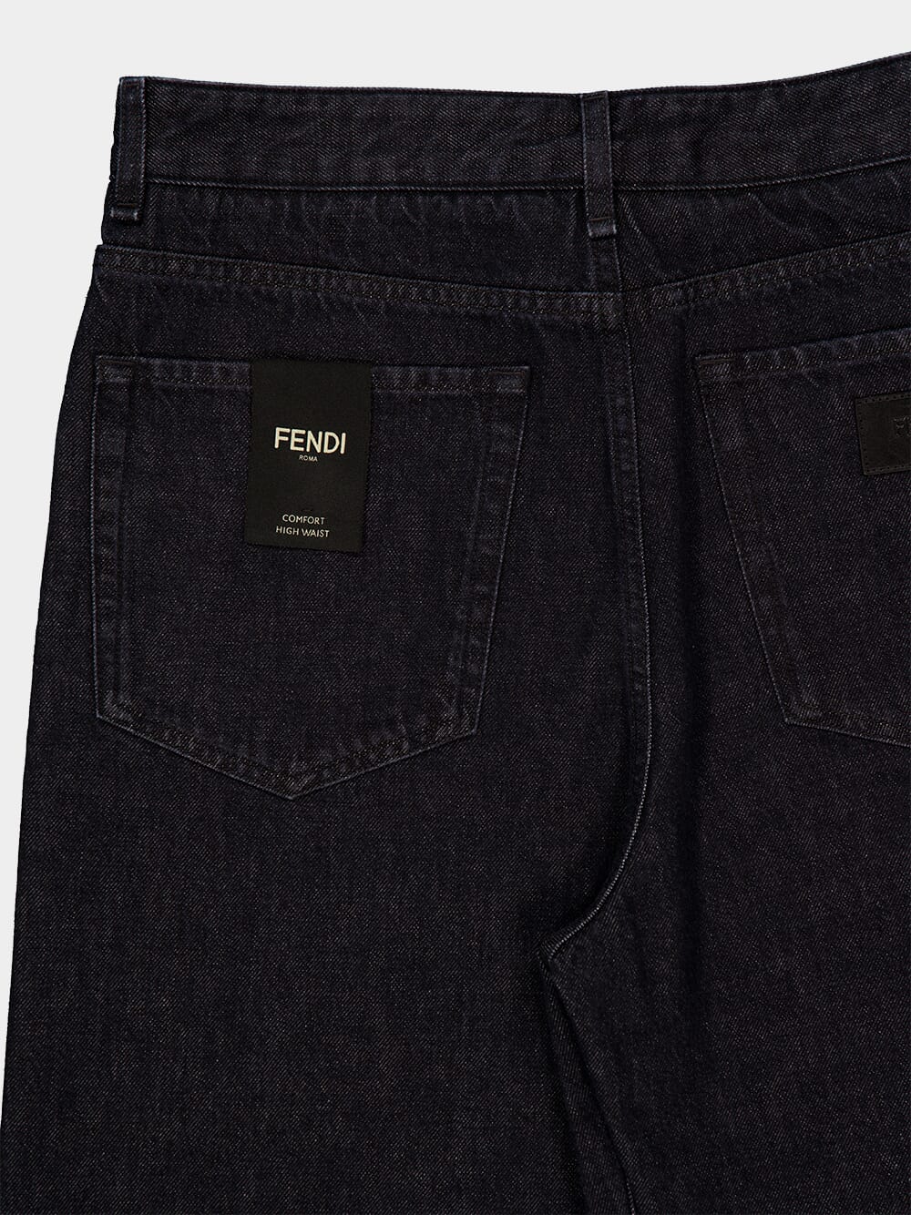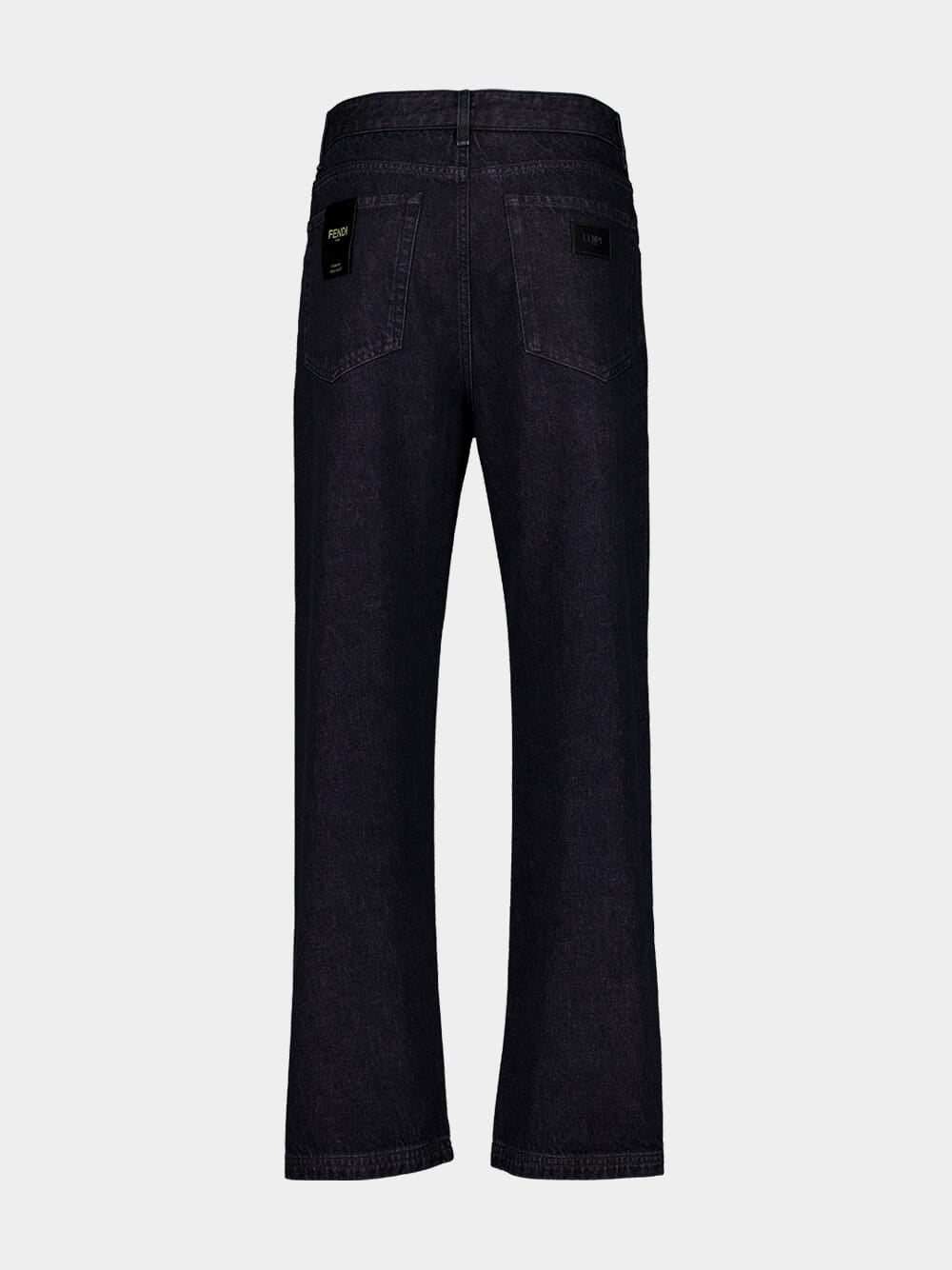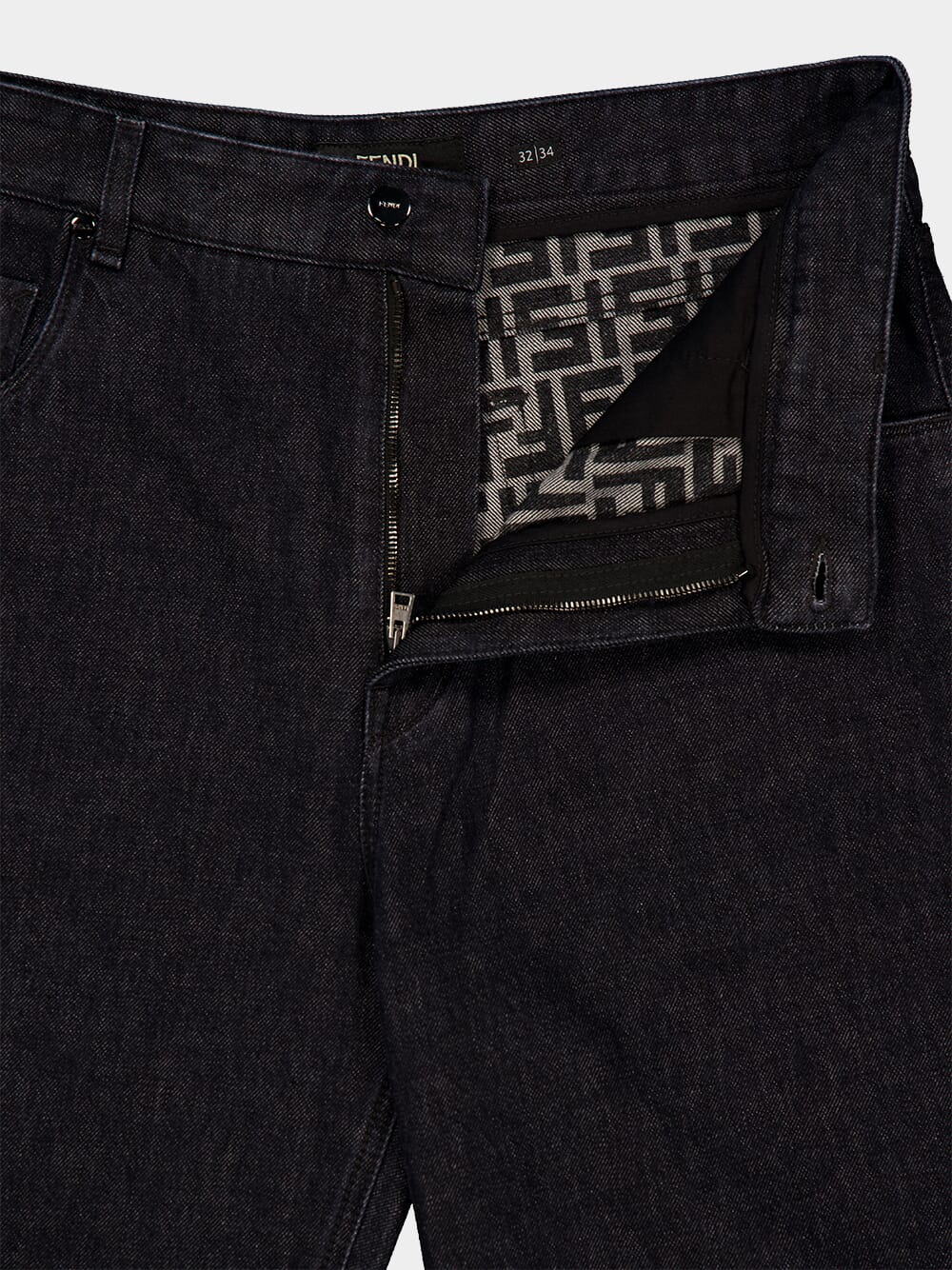 Sleek and versatile, these black denim straight-leg jeans exude understated luxury with Fendi's signature craftsmanship. Designed in a regular fit, these five-pocket trousers feature customized rivets and buttons, a concealed zip fastening, and a straight cut with a hem width of 22 cm. The interior hem is detailed with the iconic FF logo, visible when turned up, adding a subtle branded statement. Finished with the Fendi Roma leather patch on the back pocket, these jeans are a timeless wardrobe essential. Crafted in Italy from premium black denim fabric for a comfortable and durable wear.