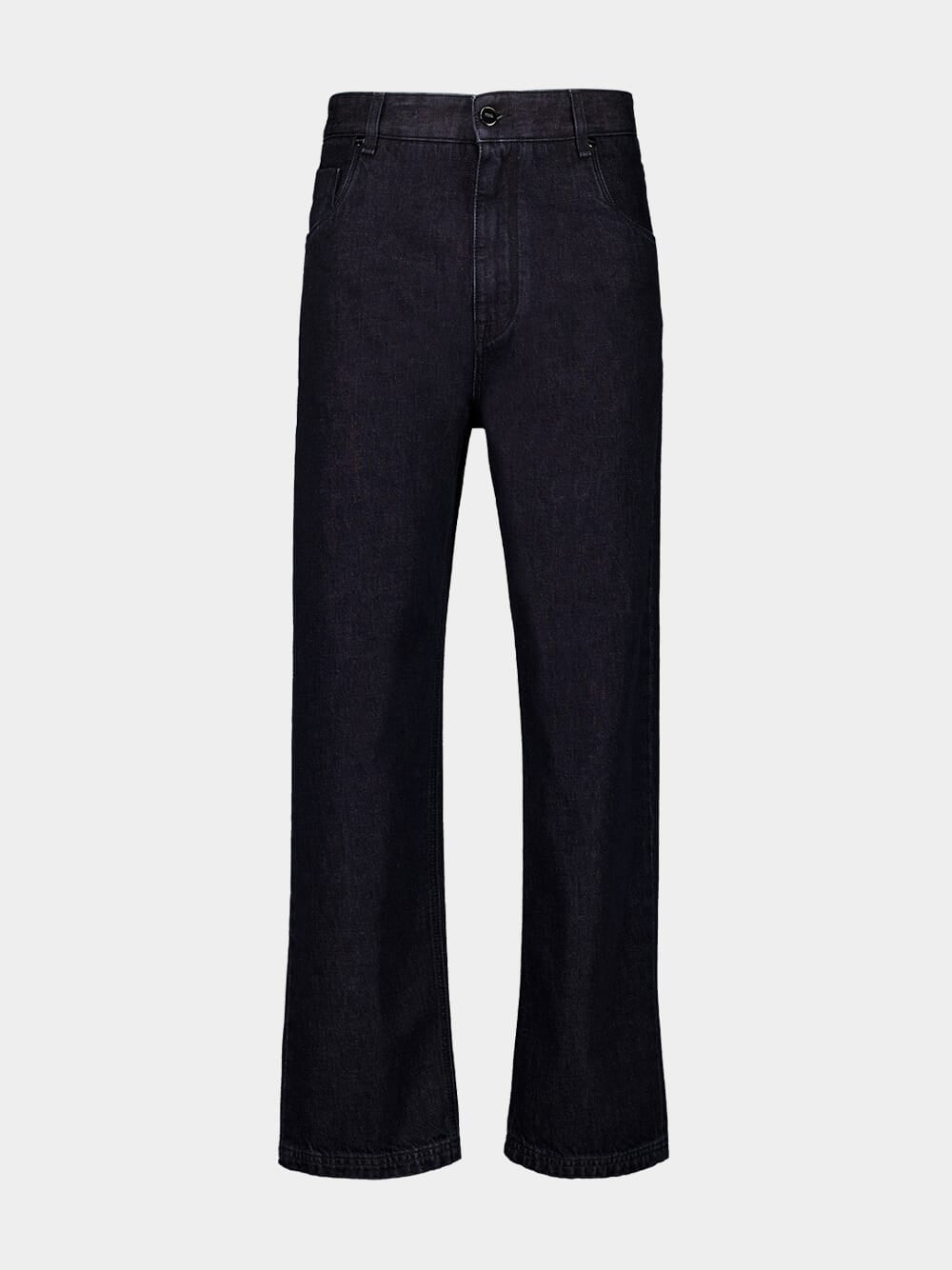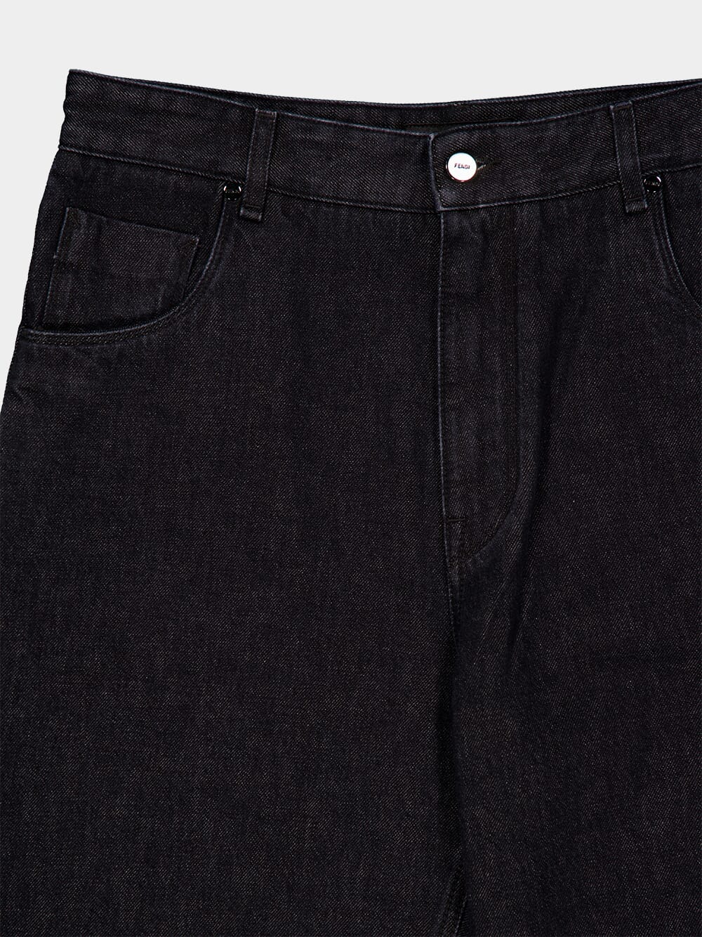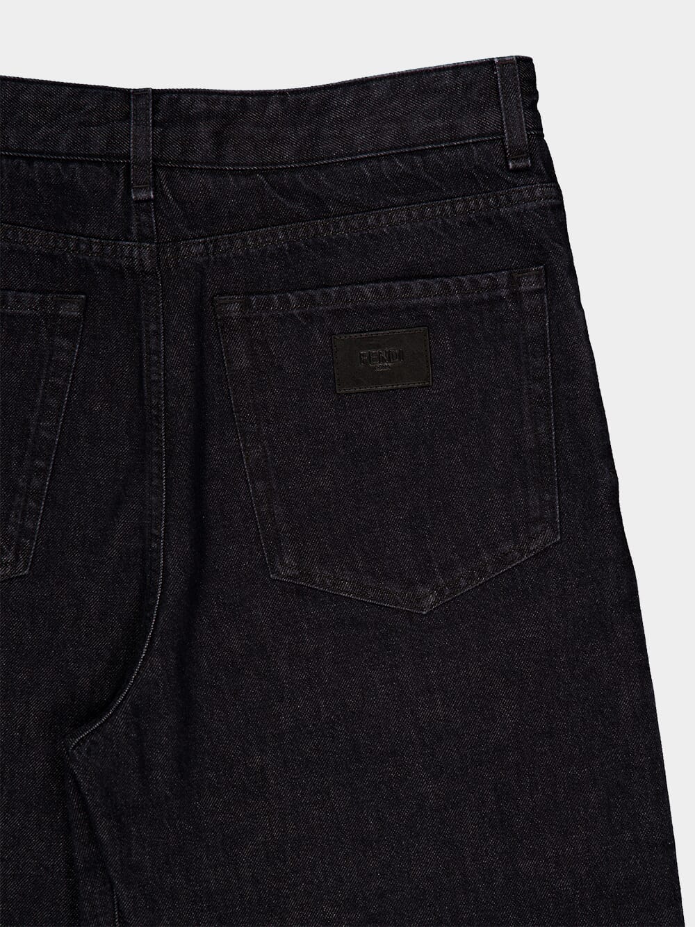 Sleek and versatile, these black denim straight-leg jeans exude understated luxury with Fendi's signature craftsmanship. Designed in a regular fit, these five-pocket trousers feature customized rivets and buttons, a concealed zip fastening, and a straight cut with a hem width of 22 cm. The interior hem is detailed with the iconic FF logo, visible when turned up, adding a subtle branded statement. Finished with the Fendi Roma leather patch on the back pocket, these jeans are a timeless wardrobe essential. Crafted in Italy from premium black denim fabric for a comfortable and durable wear.