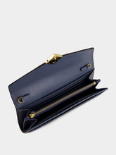 Refined and versatile, this blue calf leather wallet features Fendi's embossed FF Diamonds motif and a geometric flap with a diagonal FF logo. Designed with elegance and practicality in mind, it opens to a structured interior with two gusseted compartments, ten card slots, flat pockets, and a zip pocket. A removable gold-tone chain strap allows for crossbody or shoulder wear.