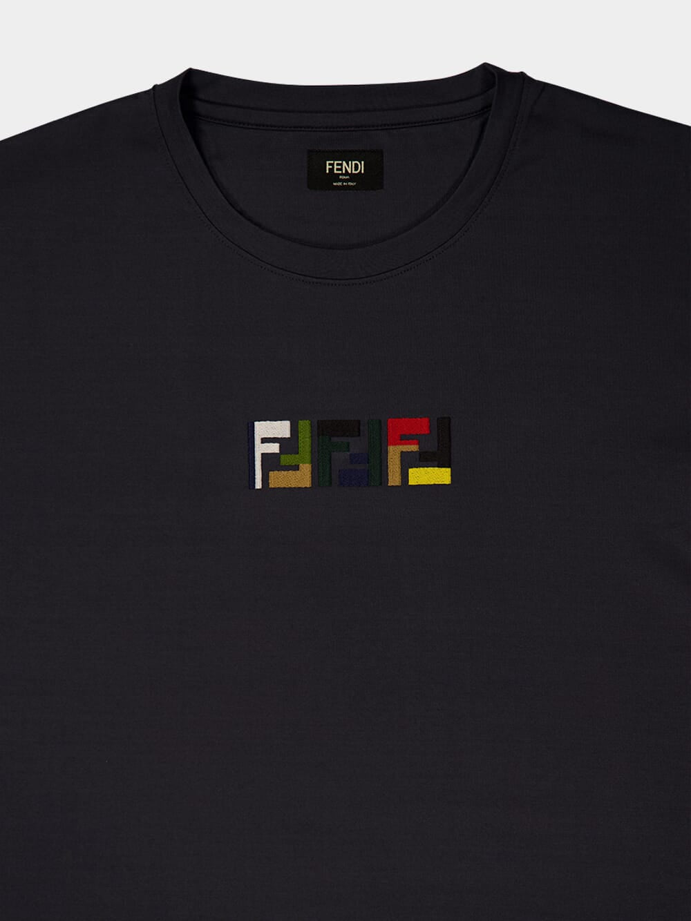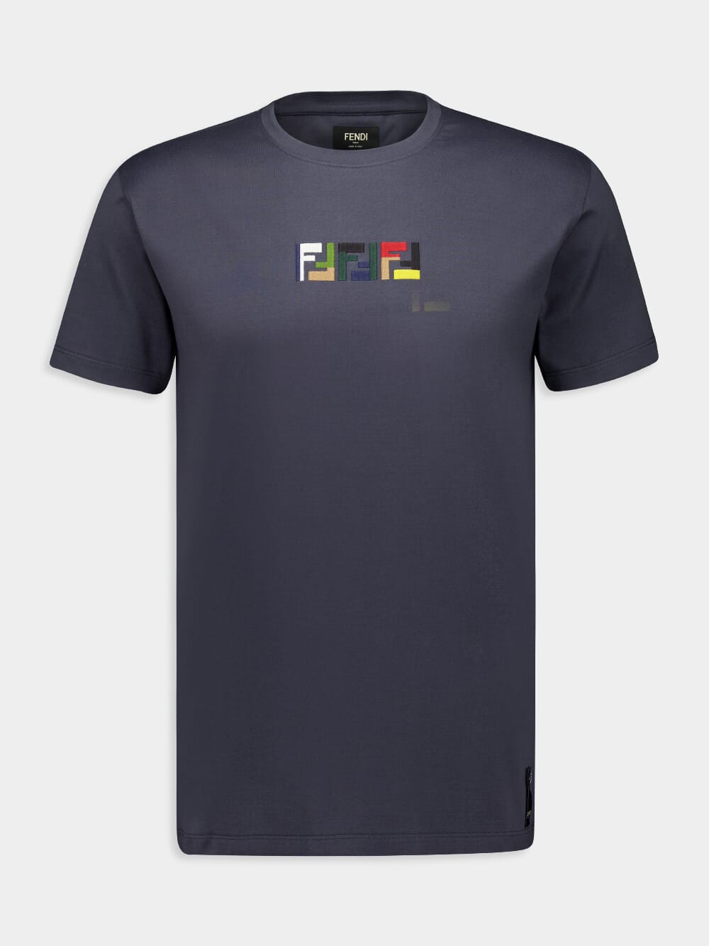 This sleek dark grey cotton T-shirt offers a refined take on casual style. Made in Italy from 100% cotton, it features a crew neck and short sleeves for a comfortable, classic fit. The chest is adorned with an embossed Triple FF logo in multicoloured thread, providing a distinctive touch of Fendi’s iconic branding. Perfect for adding a hint of luxury to everyday wear.